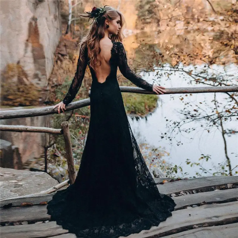 Черное кружевное платье для выпускного вечера, модель 2022 года, женское вечернее платье с длинным рукавом и открытой спиной, женское прозрачное официальное платье с юбкой-годе для вечеринки