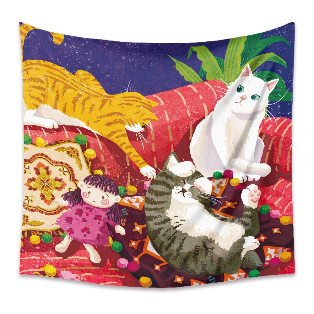 Гобелен с мультяшным милым котом, Настенный декор для детской комнаты, декор для стен в стиле хиппи, красочные ковры с животными, подвесная ткань