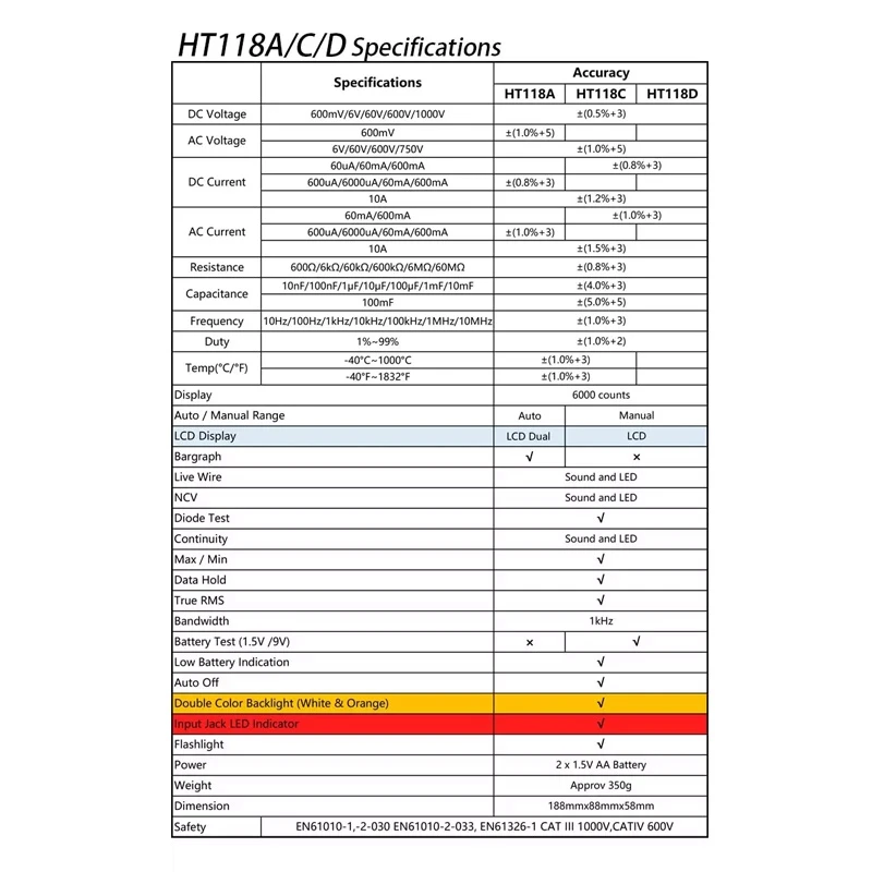 Широкий диапазон измерений: для измерения напряжения постоянного/переменного тока, постоянного/переменного тока, сопротивления, емкости, диодного теста, NCV теста, живого теста, частоты, температуры и т. Д.Диапазон температур: диапазон тестирования-40 ~ 1000 Цельсия/-40 ~ 1832 Фаренгейта, Цельсия/Фаренгейта единицы преобразования.2,7 дюймовый большой ЖК-дисплей: 59x3 6 мм ЖК-экран с большой цифровой индикацией и подсветкой для четкого чтения.Автоматическое выключение: 15 минут автоматическое выключение, если нет работы, больше экономии энергии.Портативный дизайн: кронштейн сзади для поддержки мультиметра, и его также можно повесить на стену.Защита от перегрузки: встроенный двойной предохранитель, полная защита для безопасной работы.Другие функции: барграф, максимальное/минимальное удержание, Удержание данных, непрерывность, истинная RMS, индикация низкого заряда батареи, двойной цветной задний светильник, светодиодный индикатор входного разъема, рабочий светильник и т. д.Характеристики:Дисплей: 6000 штукДиапазон: Авто ДиапазонДисплей: ЖК-дисплейПолоса пропускания: 1 кГцБезопасность: EN61010-1, -2-030 EN61010-2-033, EN61326-1 CAT III 1000V, CATIV 600VНапряжение постоянного тока: 600 мВ/6 В/60 в/600 В/1000 вНапряжение переменного тока: 600 мВ/6 В/60 в/600 В/750 ВТок постоянного тока: 600uA/6000uA/60mA/600mA/10AТок переменного тока: 600uA/6000uA/60mA/600mA/10AСопротивление: 600Ω/6k Ω/60k Ω/600k Ω/6M Ω/60MΩЕмкость: 10nF/100nF/1 мкФ/10 мкФ/100 мкФ/1mF/10mF/100mFЧастота: 10 Гц/100 Гц/1 кГц/10 кГц/100 кГц/1 МГц/10 МГцТемпература: -40 ~ 1000 Цельсия/ -40 ~ 1832 по ФаренгейтуИсточник питания: 2 * AA батареиЦвет: черныйМатериал: АБС-пластикРазмер: 188x88x58ммПосылка:1 * мультиметр2 * зонд1 * Тестовый свинец1 * Руководство пользователяТолько вышеуказанная посылка, другие товары не включены.Примечание: светильник и различные дисплеи могут привести к тому, что цвет товара на картинке немного отличается от реального. Допускается погрешность в измерениях +/- 1-3 см.