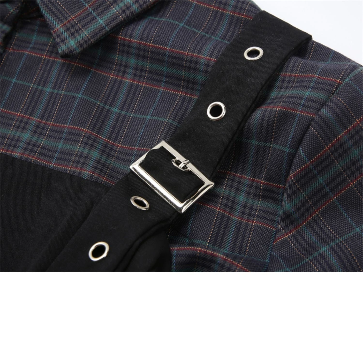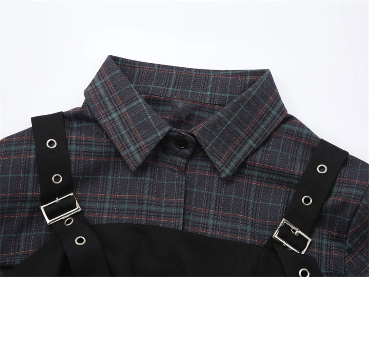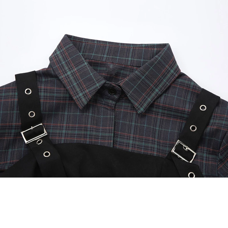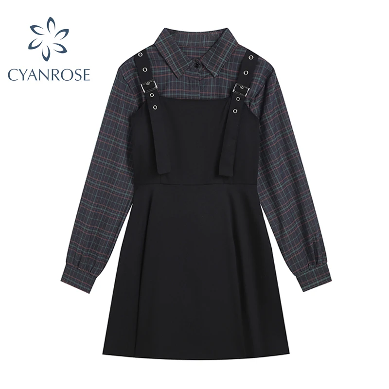 Женское черное платье, суперкороткие рубашки в клетку с длинным рукавом, осенняя уличная одежда 2021, комплекты из двух предметов в готическом стиле и стиле панк для девушек