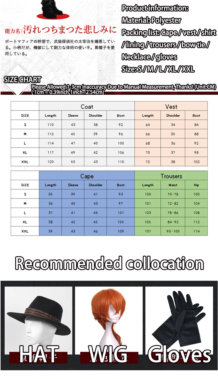 Костюм для косплея аниме Bungou Stray Dogs, униформа накахара чуя, парики и шляпа, костюм на Хэллоуин для женщин и мужчин