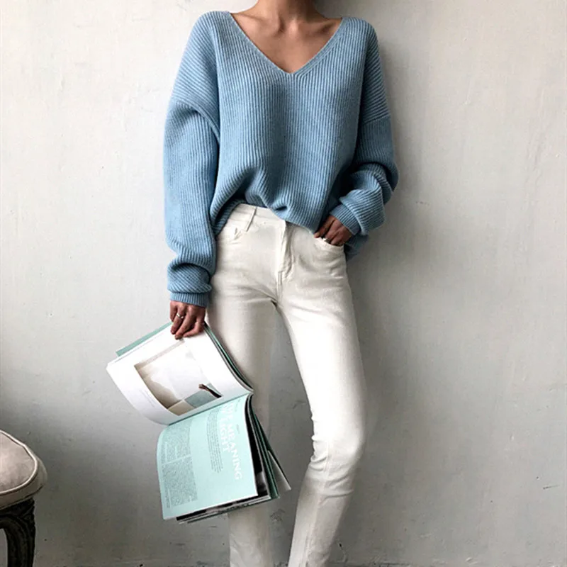 Свитер женский трикотажный голубой Syiwidii, с V-образным вырезом, ...