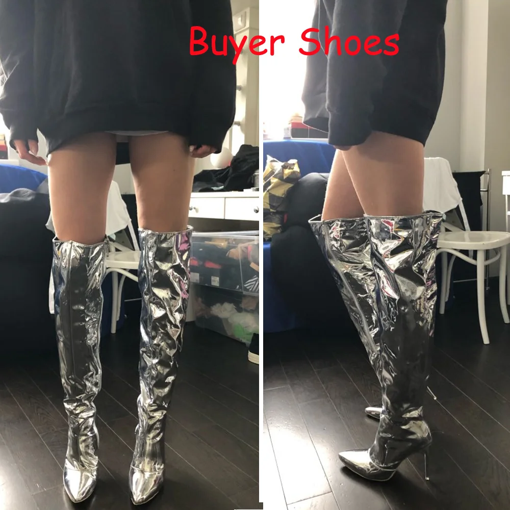 Женские сапоги выше колена, зеркальные, на платформе, заостренный носок, высокий тонкий каблук, серебристая Повседневная Праздничная обувь на молнии, Осень-зима