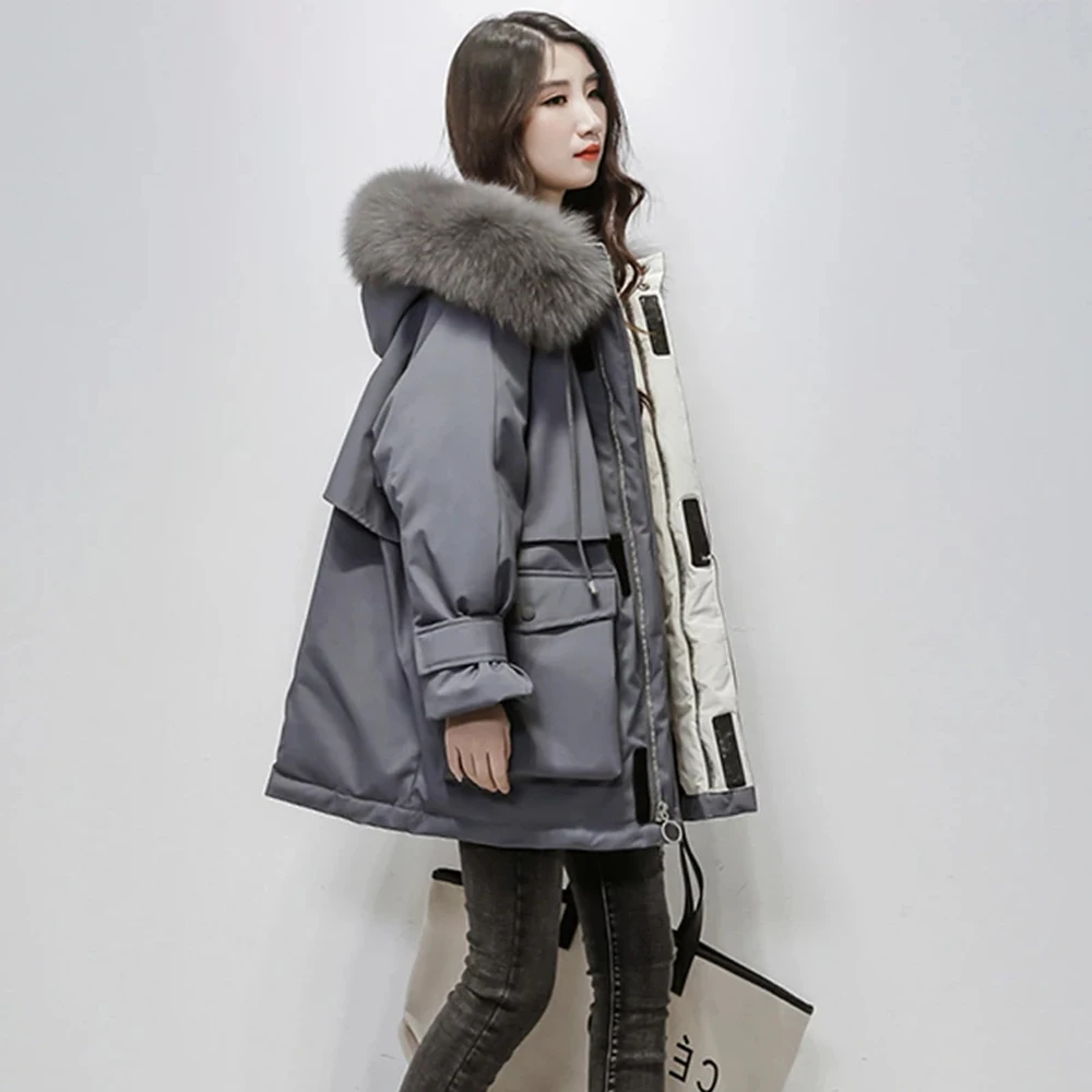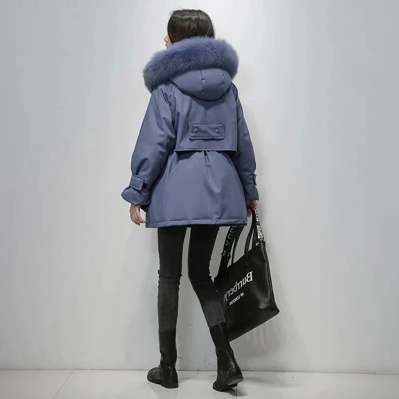 Новинка 2021, женская зимняя куртка с большим меховым воротником и капюшоном, толстые парки на белом утином пуху, теплое зимнее пальто с поясом, куртки, парки с подкладкой
