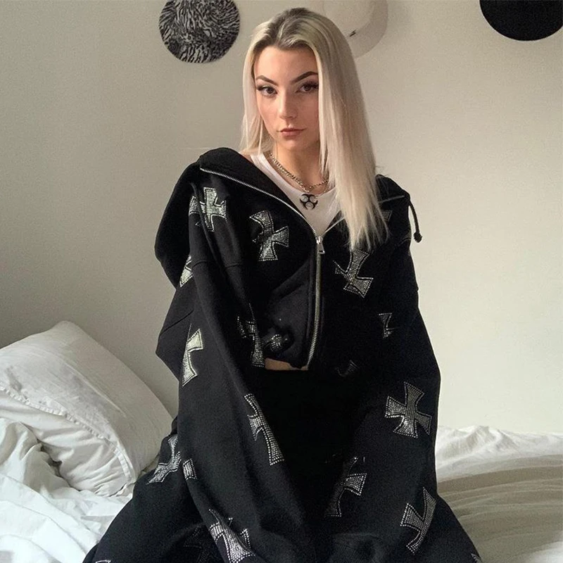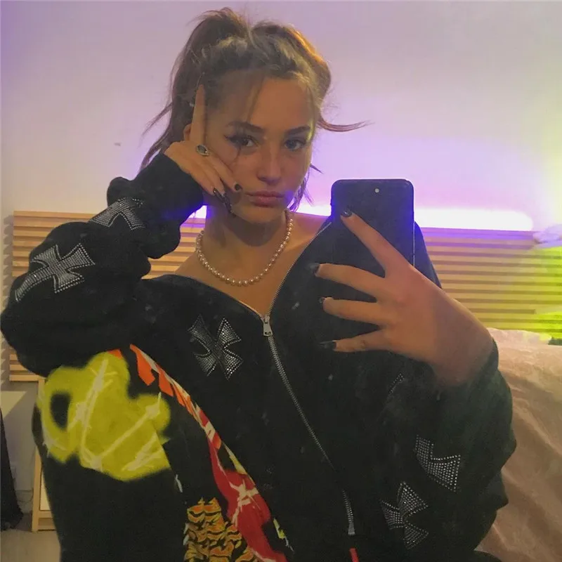 Стразы толстовки Y2k Топы женские на молнии Толстовка 90-х хип-хоп Свитшот Готическая уличная одежда куртки Harajuku модное пальто унисекс