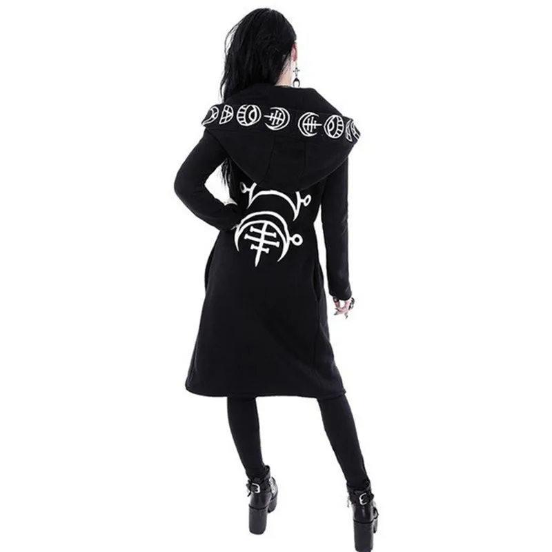 Длинное пальто с капюшоном, женская теплая куртка с длинным рукавом в готическом стиле и панк-принтом, женская уличная одежда, толстовка большого размера на молнии, Осень-зима