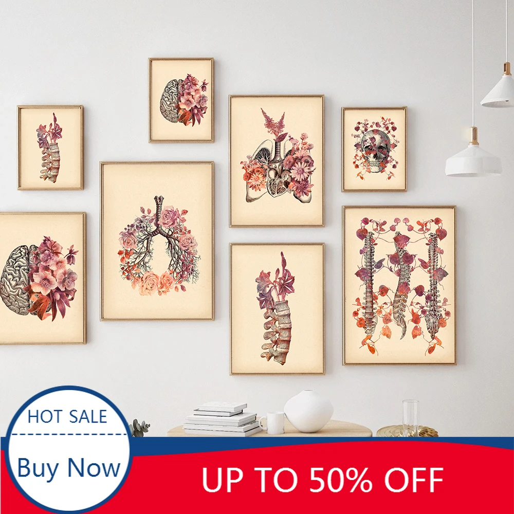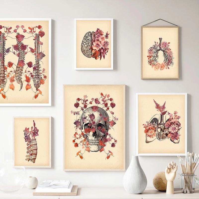 Медицинский человеческий тело, настенный художественный плакат, цветок, орган, холст, с принтом "Скелет" мускулов, винтажная картина, украшение для гостиной