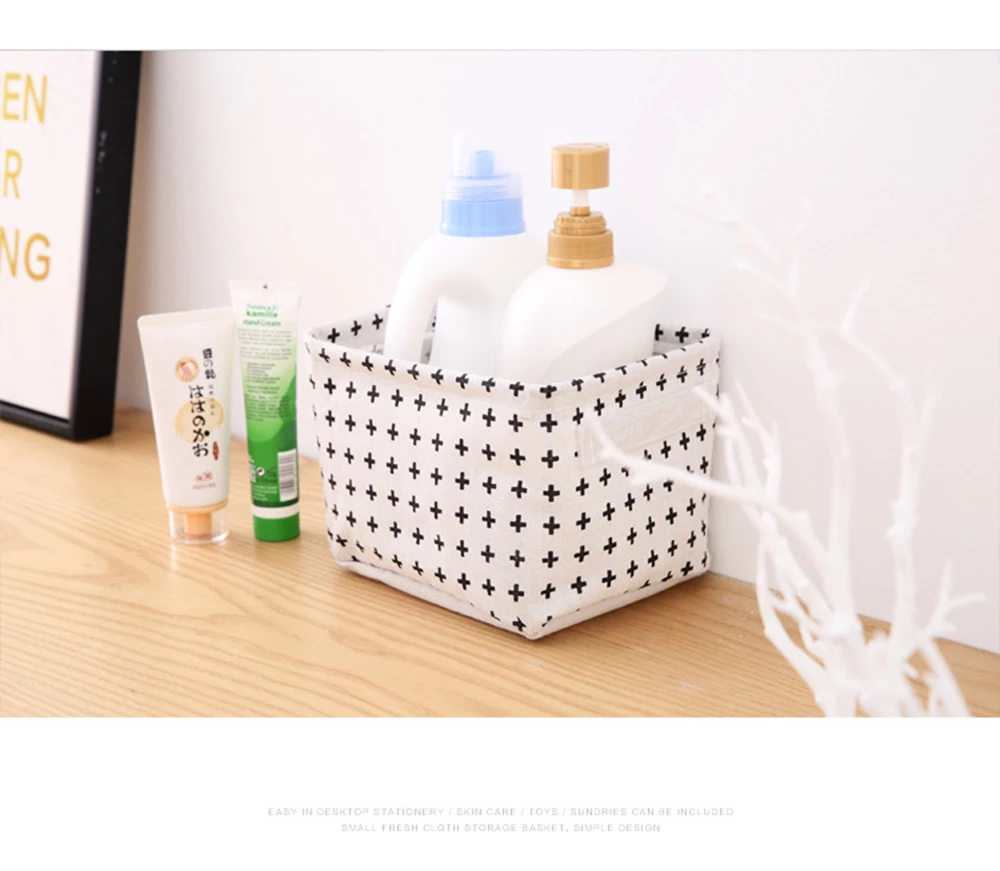 Название: маленькая корзина для хранения свежей тканиМесто происхождения: Иу, КитайРазмер: 15x14x19 смСпецификация: 4 цветаМатериал: холстОсобенности: простой узор, красивый и щедрый; Стильный, легко стоять на столе, можно хранить канцелярские товары/средства по уходу за кожей/игрушки/sundry etc.1; Ручки с обеих сторон, удобно носить с собой, складывать и хранить, когда не используется, экономит место