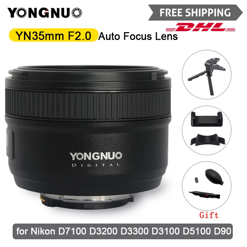 Объектив YONGNUO YN 35 мм F2.0 с автофокусом, широкоугольный объектив с большой диафрагмой для камеры Nikon F Mount D3200 D3400 D3100 DLSR