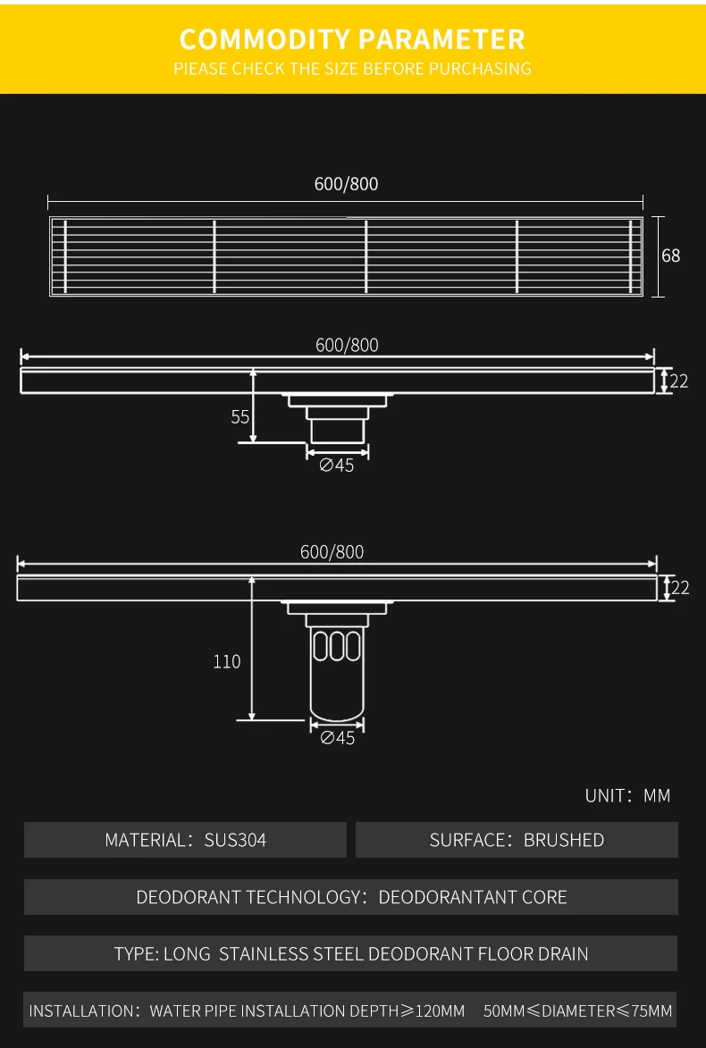 Слив для душа 80 см, с защитой от запаха, SUS 304 сток в полу из не...
