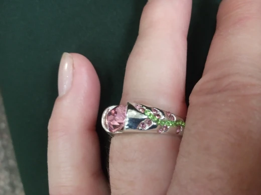 Кольцо просто сказка, переливается розовый камень ну просто глаз не оторвать, маленькие камушки зеленые и розовые дополняют розовый большой камушек своим блеском. Я очарована этим кольцом, да еще за такие деньги. Доставка 20 дней. Очень благодарна продавцу за такую красоту и быструю отправку. Рекомендую.