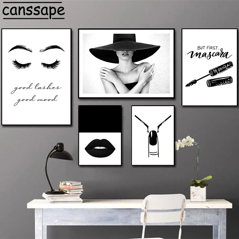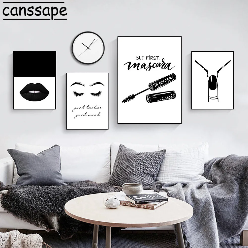 Черно-белая холщовая картина, модный постер для макияжа, губы, ресницы, Настенная картина, скандинавские настенные картины для декора гостиной