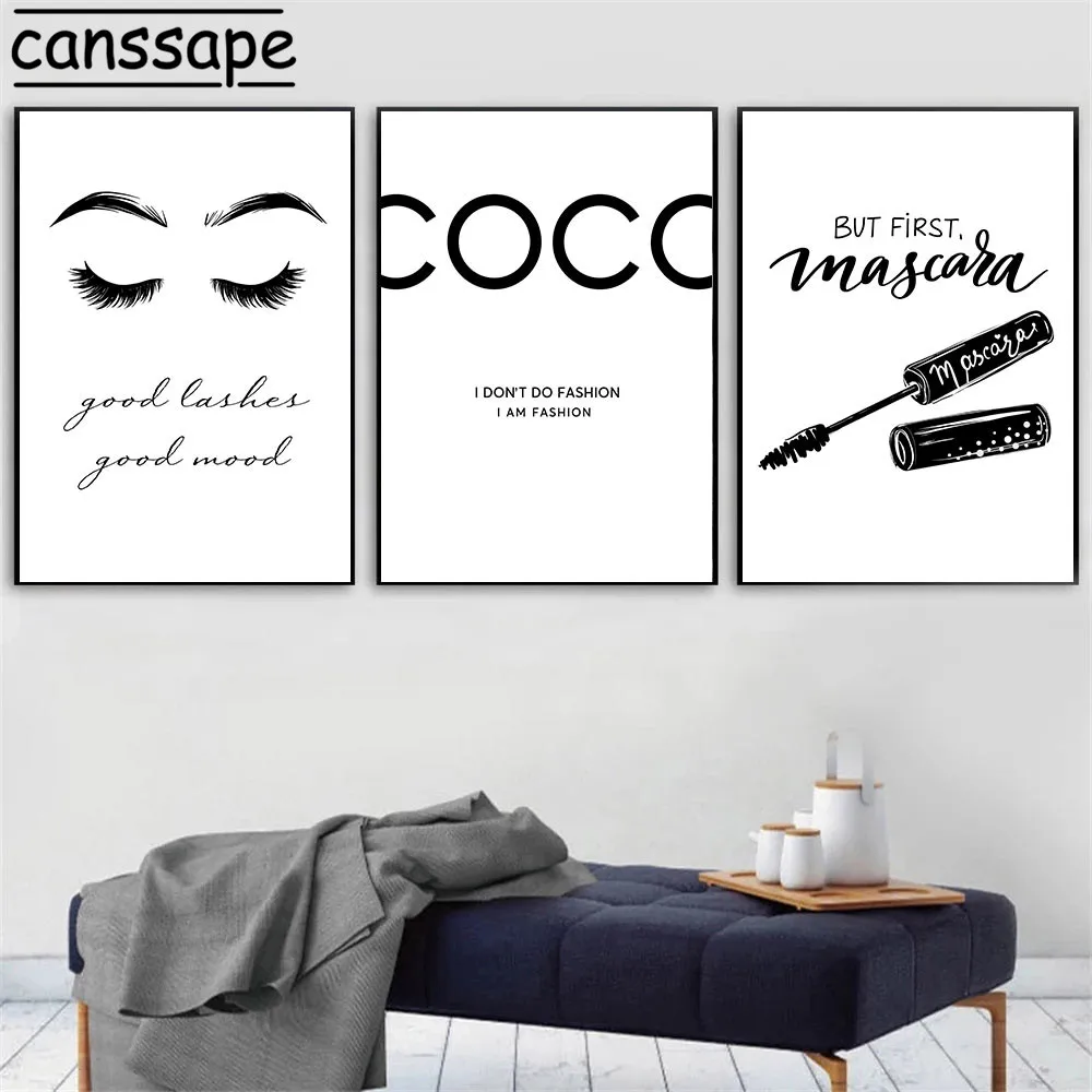 Черный и белый холст, модный постер для макияжа, губы, ресницы, настенная Художественная печать, скандинавские настенные картинки для декора гостиной