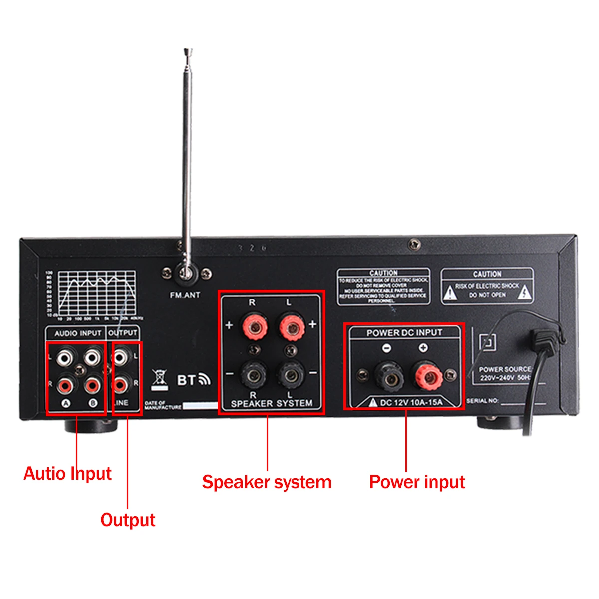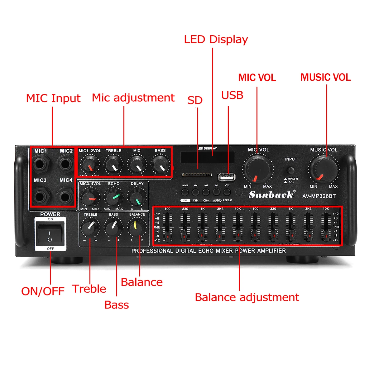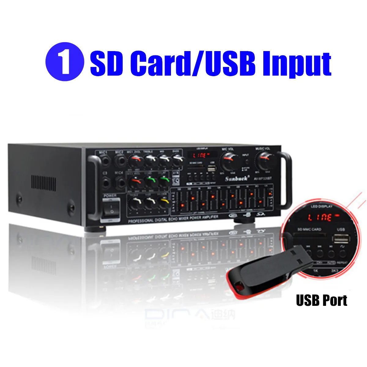 Аудио усилитель SUNBUCK 2000 Вт, 5,0, bluetooth, 2 канала, Hi-Fi, стерео, 326BT, DC 12 В, 220 В, AV-усилитель, динамик, реверберация, равновесие