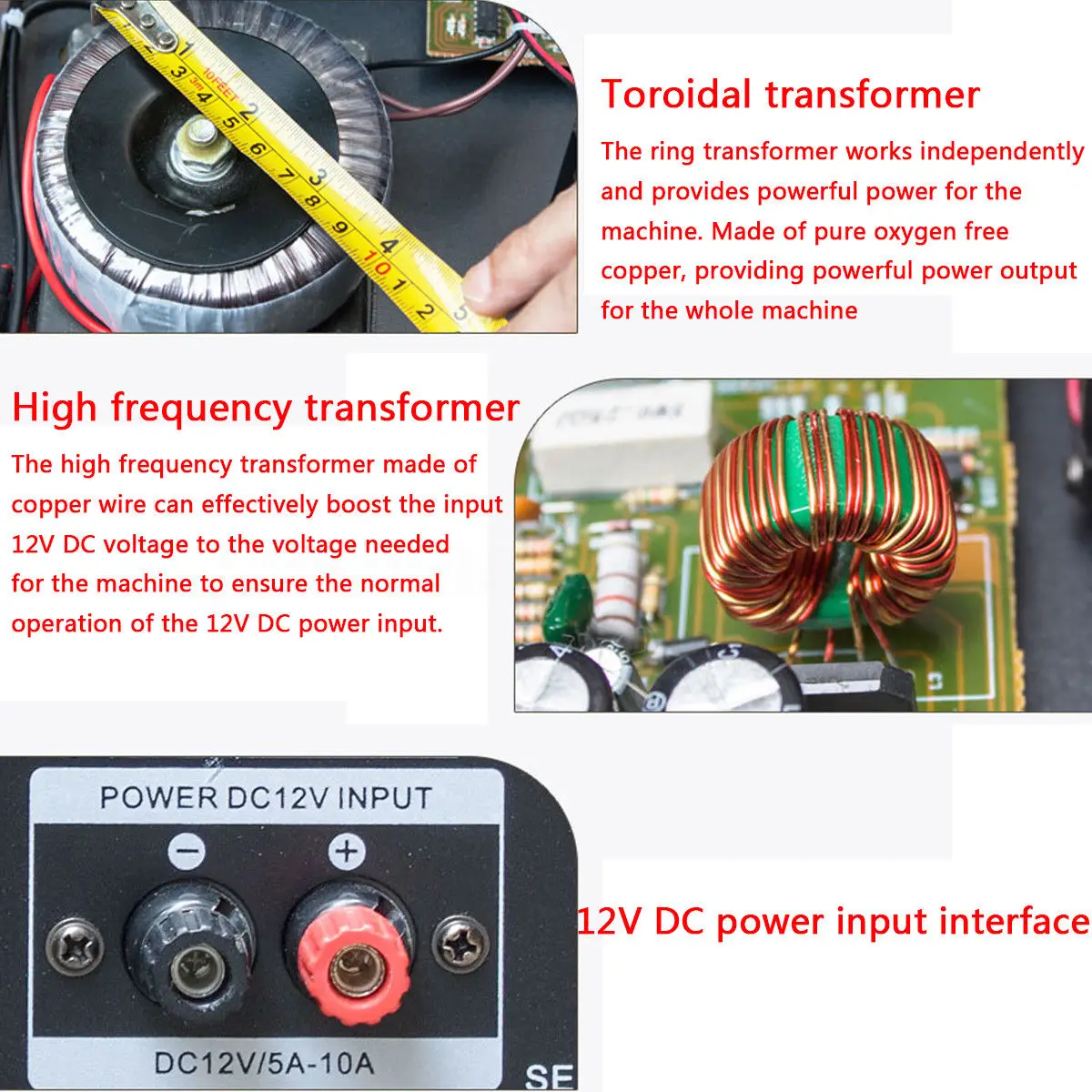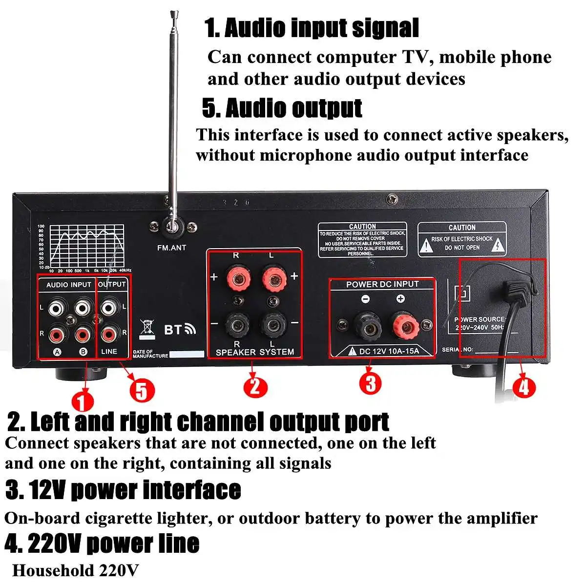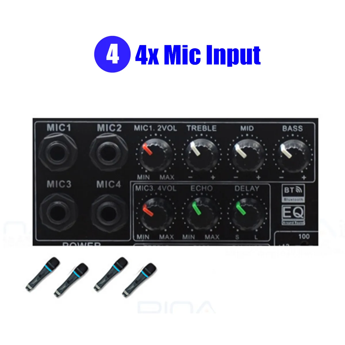 -Полнофункциональный, с bluetooth 5,0, с fm-радио, с светодиодный дисплеем, с входом DC12V, с 4 входами микрофона, с ревербецией микрофона и регулировкой задержки, поставляется с 5-полосным эквалайзером смеситель функция.