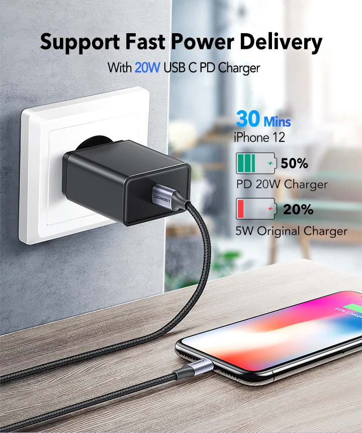 Кабель Ugreen MFI с usb c на lightning, сертифицированное зарядное ...