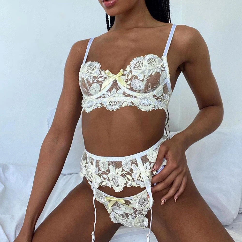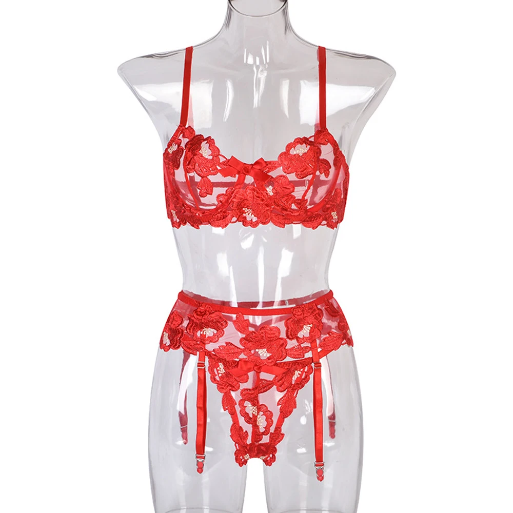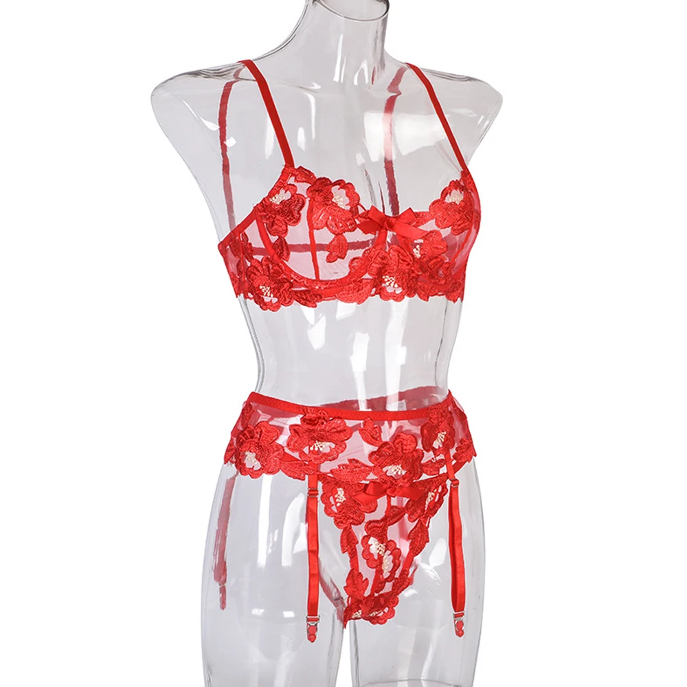 Комплект из 3 предметов, цветочное чувственное нижнее белье, женское сексуальное нижнее белье с вышивкой, бюстгальтер на косточках с подвязками, кружевной Эротический бюстгальтер и трусики, комплект