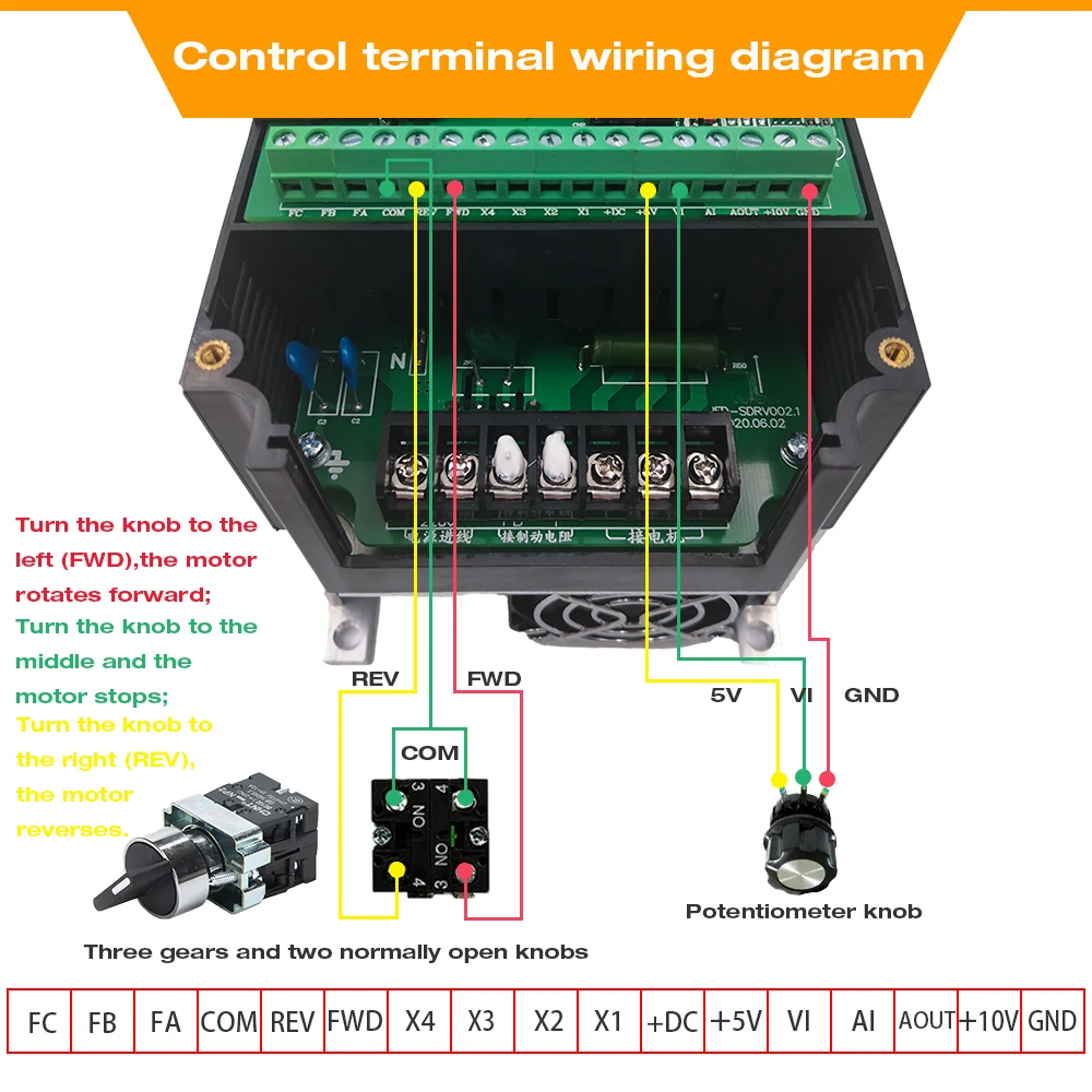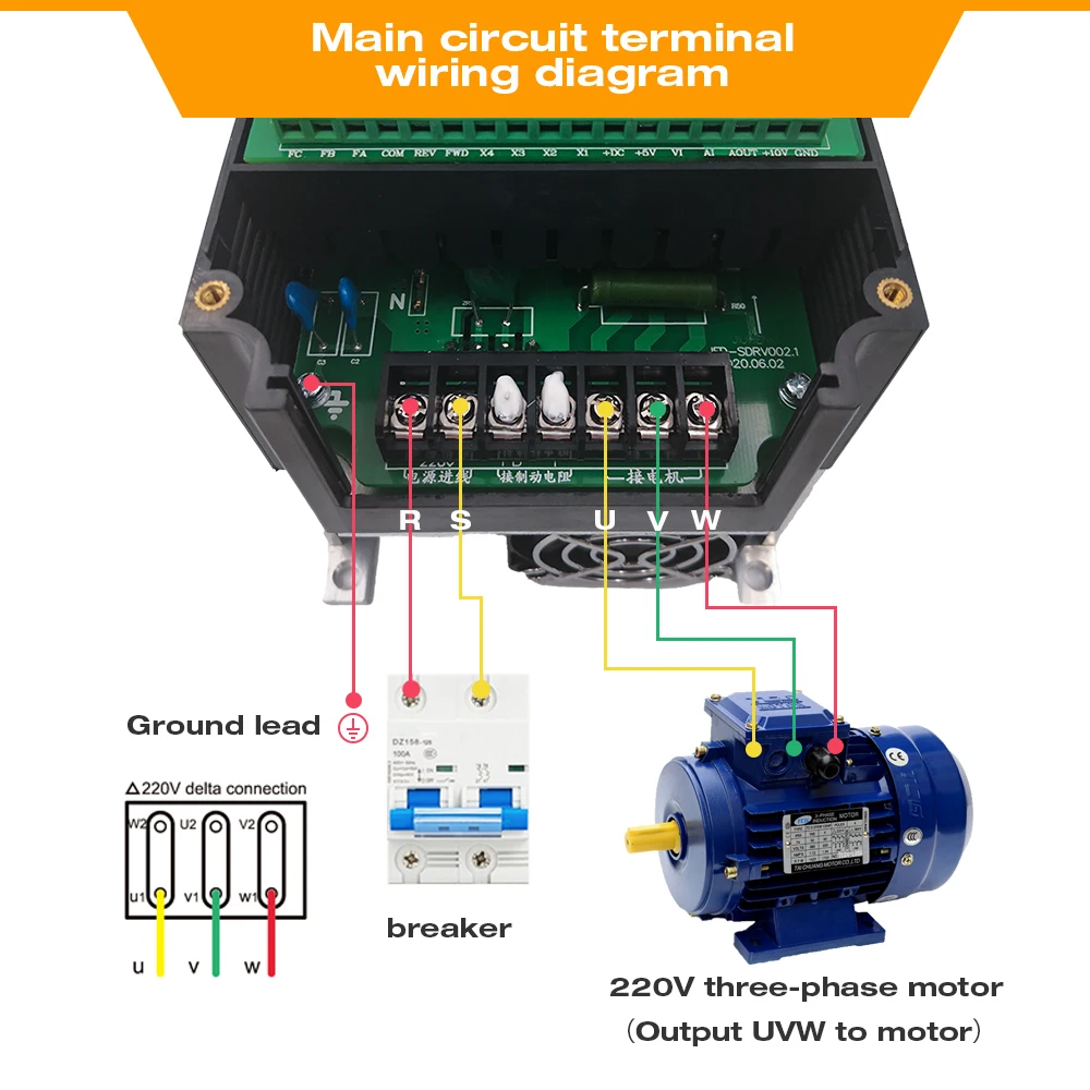 Этот продукт является высокопроизводительным приводом, мощность 1,5 кВт или 2,2 кВт, вход однофазный 220 В/50 Гц или 60 Гц, выход Трехфазный 220 В/0-50 Гц или 0-400 Гц, выходной ток 8А. Входное завершение R S, выходной терминал U V W подключен к двигателюДетали продукта