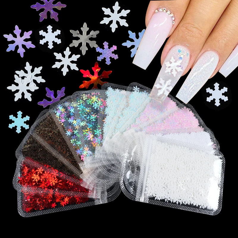 Информация о продукте: Количество: 1 сумка Цвет: цвет насыщенный Дизайн: блестки в форме снежинки Женские украшения для дизайна ногтей DIY Посылка: 1 сумка со снежинками и блестками для ногтей