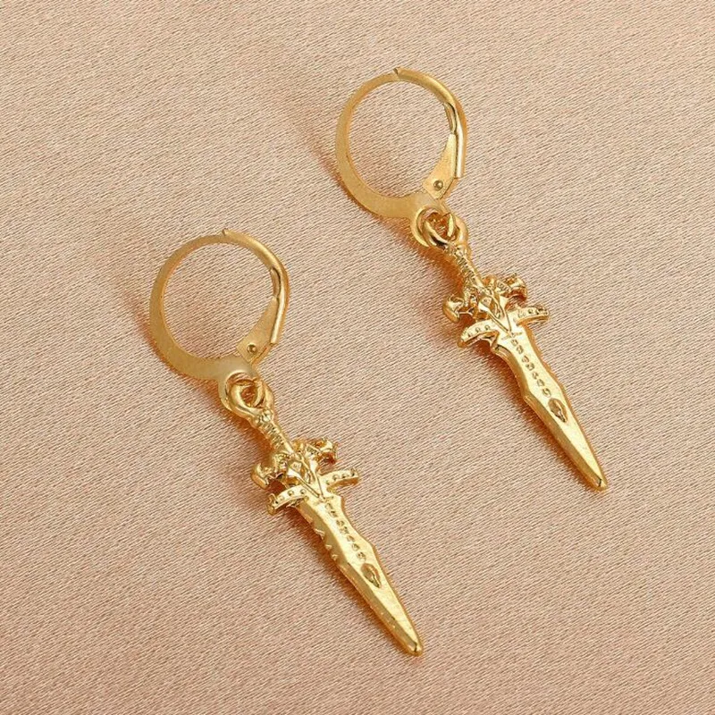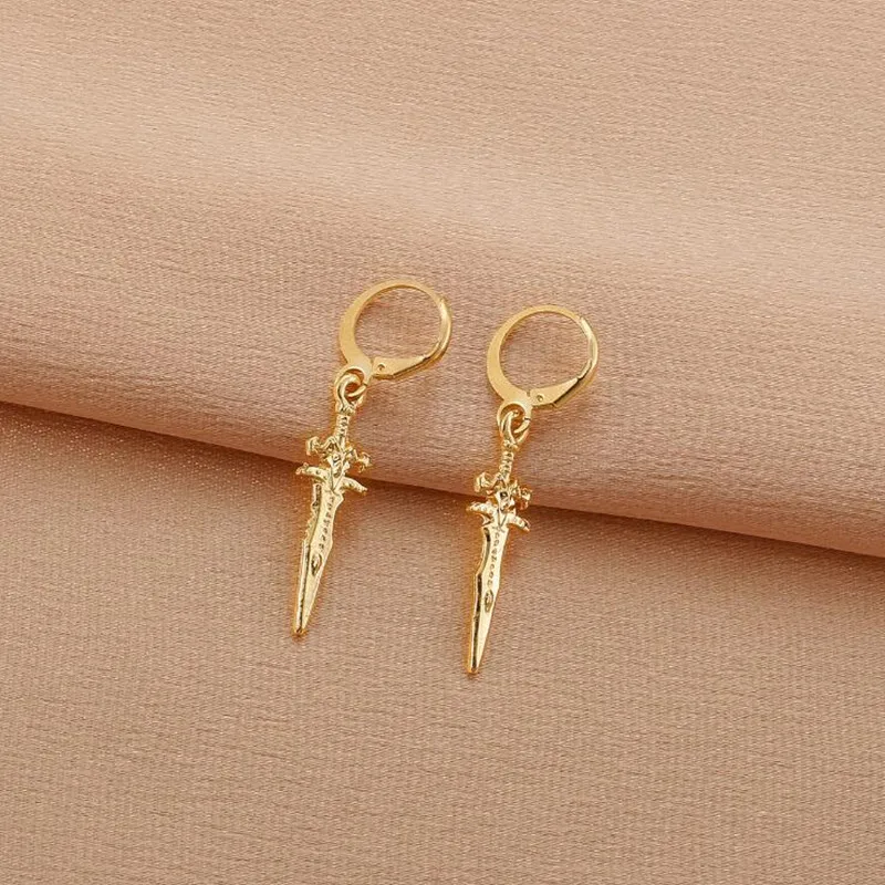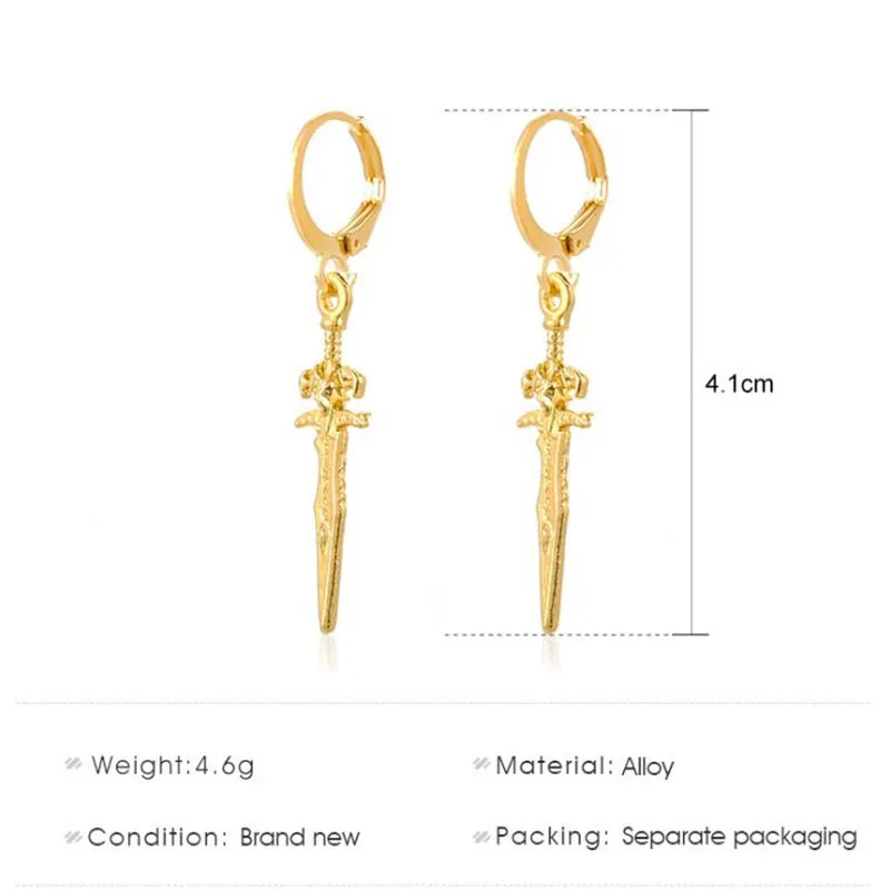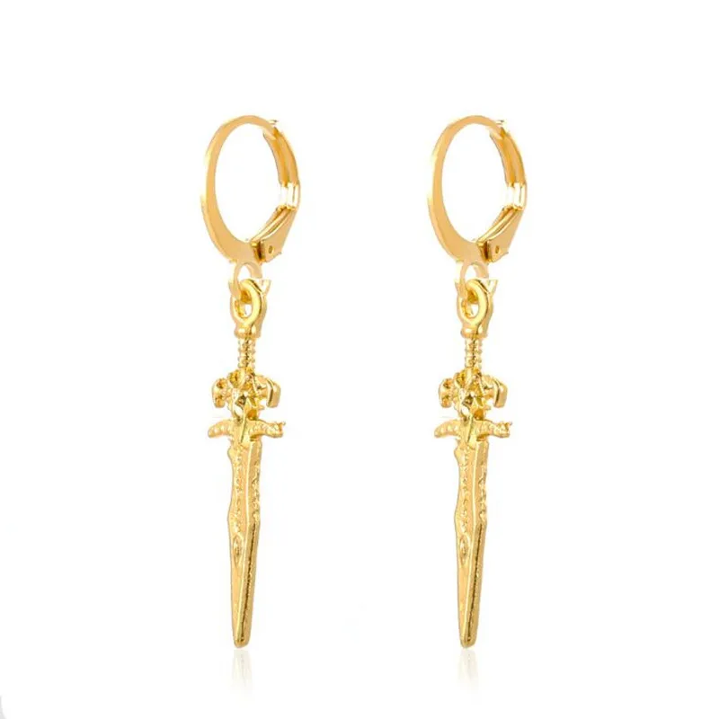 Крутые серьги-подвески в стиле панк золотого цвета с мечом для женщ...