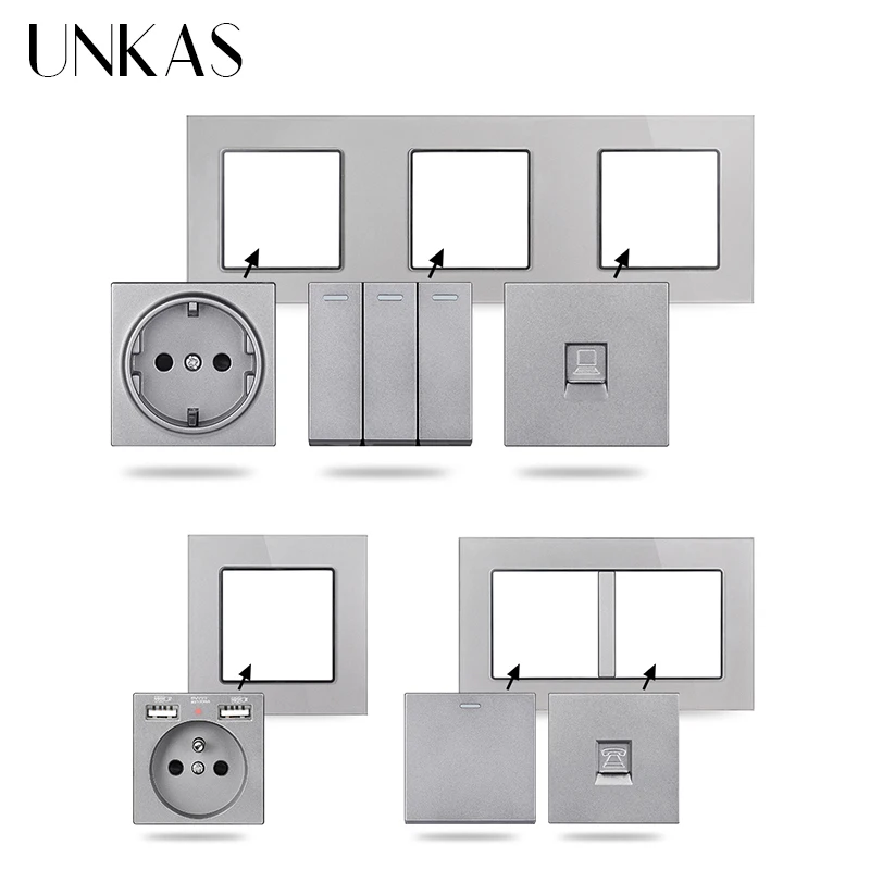 UNKAS серая стеклянная панель DIY Комбинация, Бесплатная соответствующая французская розетка европейского стандарта, двойной USB 1, 2, 3, 4 комплекта, 1/2 кнопка включения/выключения