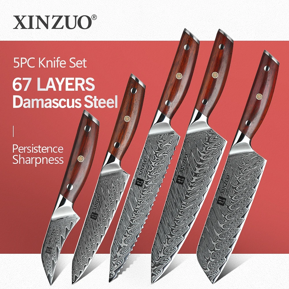 Набор ножей XINZUO из высококачественной углеродистой дамасской нержавеющей стали, японские шеф-повара сантоку из дамасской стали, ножи для очистки хлеба, 5 шт.
