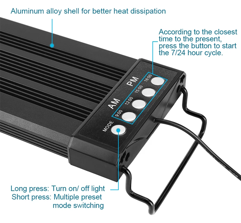 Аквариумный светодиодный светильник ing 24/7 часов автоматизированный с регулятором затемнения Sunrise Sunset светильник для аквариума RGB 110V 220V 35-80cmОписание товараПродукт: 7/24h Sunrise Sunset Dimming RGB LightingМатериал: алюминиевый сплавМодель: HL40A/HL60AМощность: 11 Вт/18 ВтЛампа Длина: 28,5/50,5 смПодходит для аквариума: 35-55 см/55-80 смМодель лампы: белый: SMD 2835RGB: SMD 5050Люмен: 600/1200лмМощность Длина шнура: 1,5 м/1,8 мНапряжение: 110-240 ВПримечание: пульт дистанционного управления не содержит батарей, режим работы батареи: аккумулятор CR2025Особенности1. 7/24 часовой режим цикла может быть установлен для реализации автоматического освещения, восхода и заката.2. Есть 4 предустановленных режима Погодный светильник, облачный, солнечный, светильник ning и лунный светильник.3. Если вы выходите из автоматического режима 7/24 часов, вы можете использовать пользовательский режим затемнения для настройки ваших любимых цветов RGB.4. Использование высокой яркости SMD2835 + 5050 ламповых бусин, ярче и Энергосберегающе.5. С функцией цветной памяти, до 4 групп цветов могут быть запоминаны.6. Полноспектральное освещение больше подходит для роста растений.7. С пультом дистанционного управления, вы можете использовать пульт дистанционного управления для управления светом.Посылка включает в себя1 комплект x аквариумное светодиодное освещение