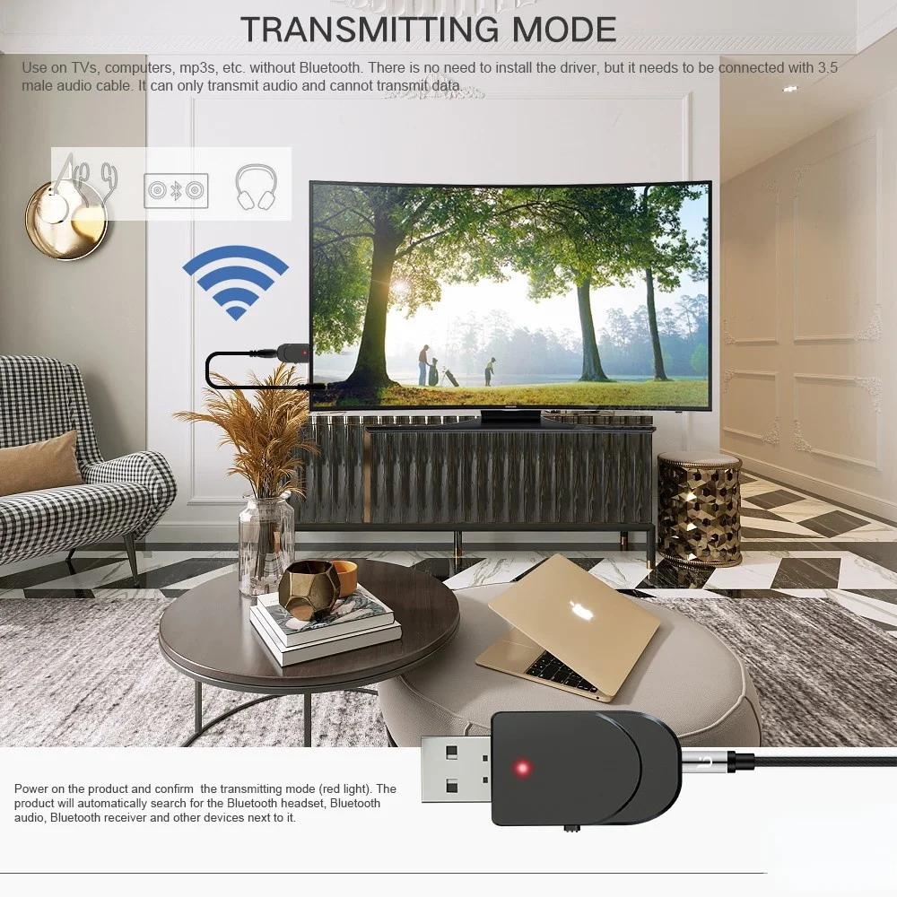 Компьютера и ТВ аудио передатчик режим: беспроводной передачи аудио с вашего компьютера или ТВ на bluetooth-гарнитуру или динамик (через USB порт, не нужно использовать 3,5 мм аудио-кабель).