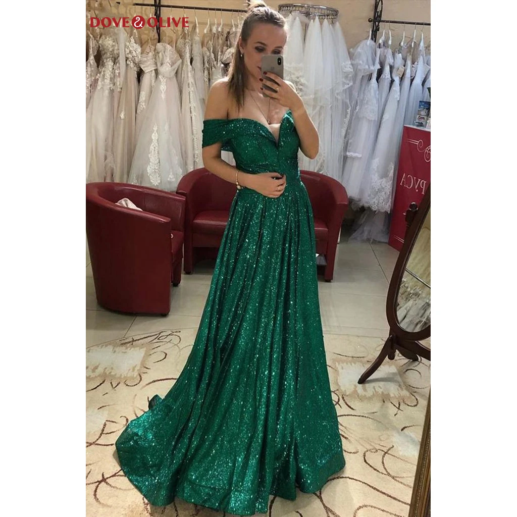 Блестящие вечерние платья Hunter Green для выпускного вечера, блестящие вечерние платья с открытыми плечами и вырезом сердечком, трапециевидного силуэта, со шлейфом, 2021