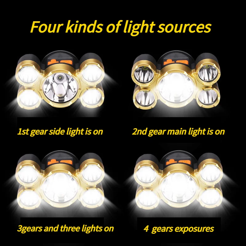Налобный фонарь с пятью головками, перезаряжаемый, светодиодный, для аварийной рыбалки