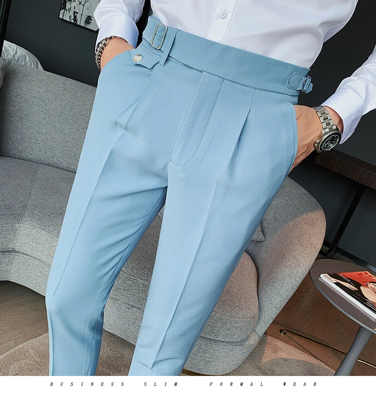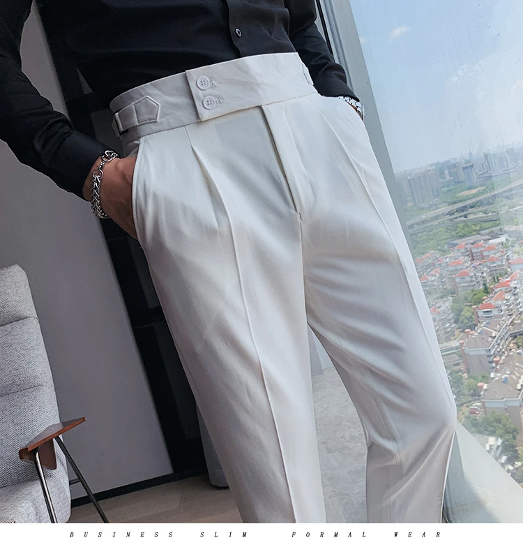 Мужские брюки с завышенной талией, однотонные английские деловые повседневные Костюмные брюки с поясом, прямые облегающие брюки, белая одежда, новинка 2021
