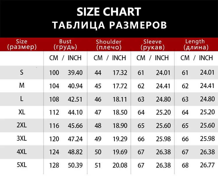 • Пожалуйста, строго следуйте таблице размеров, чтобы выбрать размер. Не выбирайте напрямую в соответствии с вашими привычками. • Изделие измеряется вручную, оно может отличаться на 2-4 см. • Эта куртка в азиатских размеров, Азиатские размеры меньше примерно на 2 размера, чем евро/американских размеров. • Все вышеуказанные измерения являются фактическими измерениями одежды. Для хорошей посадки, пожалуйста, при выборе размера из таблицы выше, добавьте 8 см ~ 10 см к груди вашего тела. • Пожалуйста, отметьте свой рост и вес, чтобы проверить свой размер при размещении заказа.