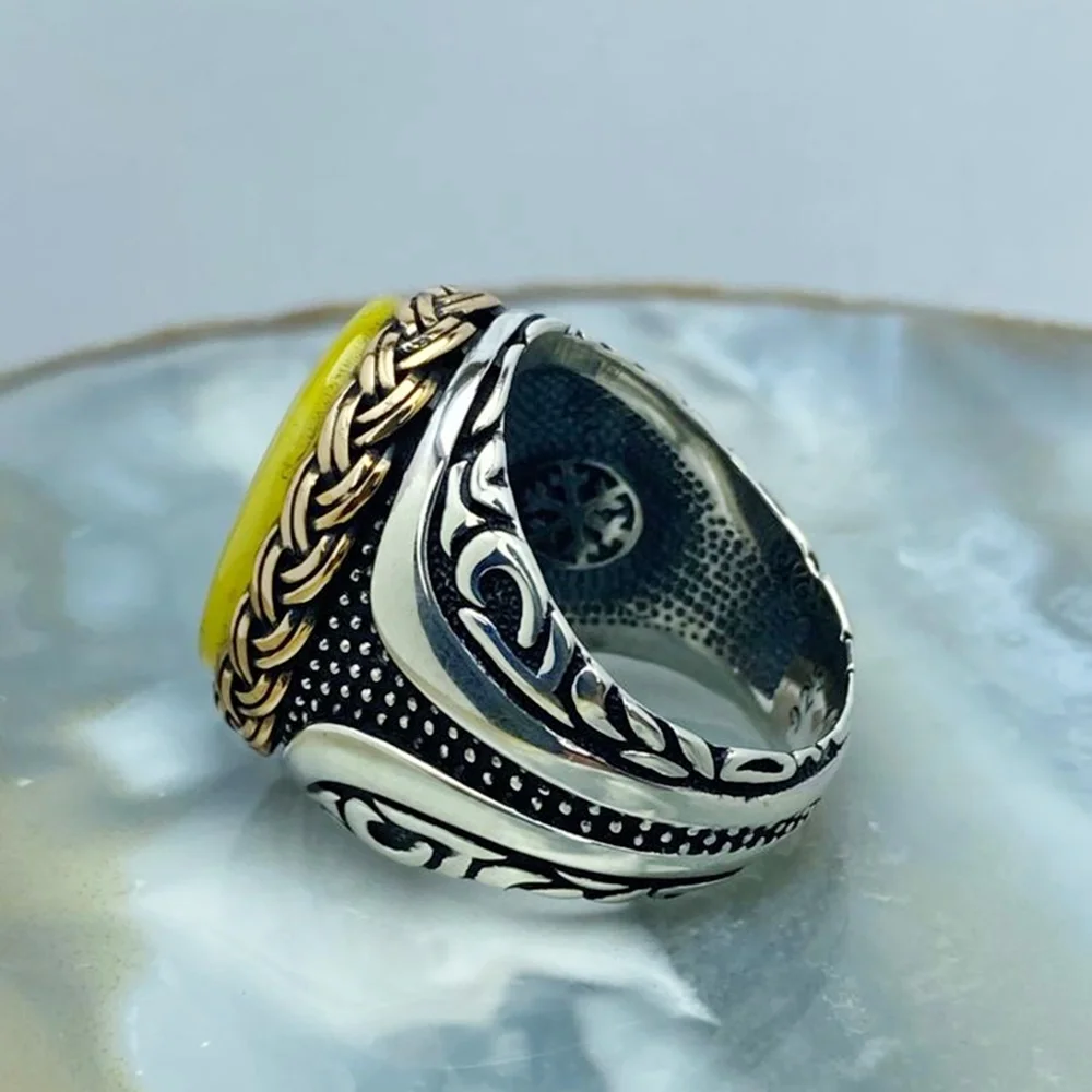 Кольцо мужское из серебра 925 пробы, с желтым агатом