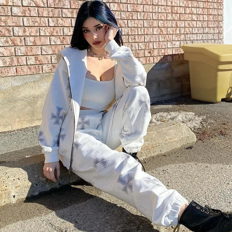 Y2k Harajuku Cross Стразы прямые широкие брюки костюм женские амери...