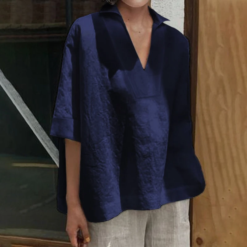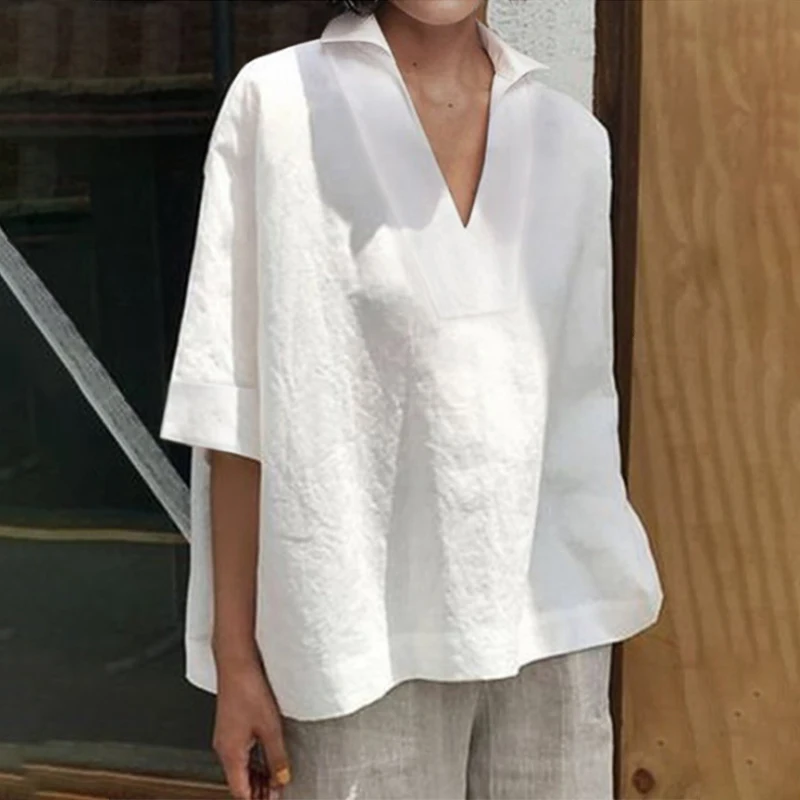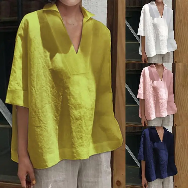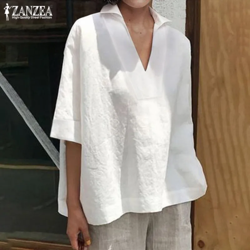 Винтажные женские летние блузки ZANZEA 2022, однотонные топы, повседневные блузы с рукавом 34, Женская туника с V-образным вырезом, Женская хлопковая рубашка оверсайз