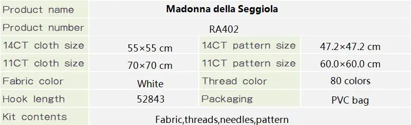 Набор для вышивки крестиком Joy Sunday Madonna Della Seggiola 11CT 14CT игла для вышивки и набор ниток картина для украшения домаПримечание:1. Это Набор для вышивания своими руками, вам нужно сделать вышивку своими руками.2. Размер, указанный на обложке посылка, относится к размеру ткани для вышивки, а не к размеру рисунка.3. Рисунок ткани напечатан на холсте. Поэтому ткань для вышивки нельзя замачивать в воде до завершения вышивки крестиком, иначе напечатанная часть исчезнет.4. Ткань без принта, ткань для вышивки белая, на ткани для вышивания нет напечатанного рисунка, его необходимо вышивать в соответствии с рисунками.5. После шитья Замочите ткань для вышивания в теплой воде на 1 час, затем достаньте ее для сушки, а затем сделайте для нее рамку.