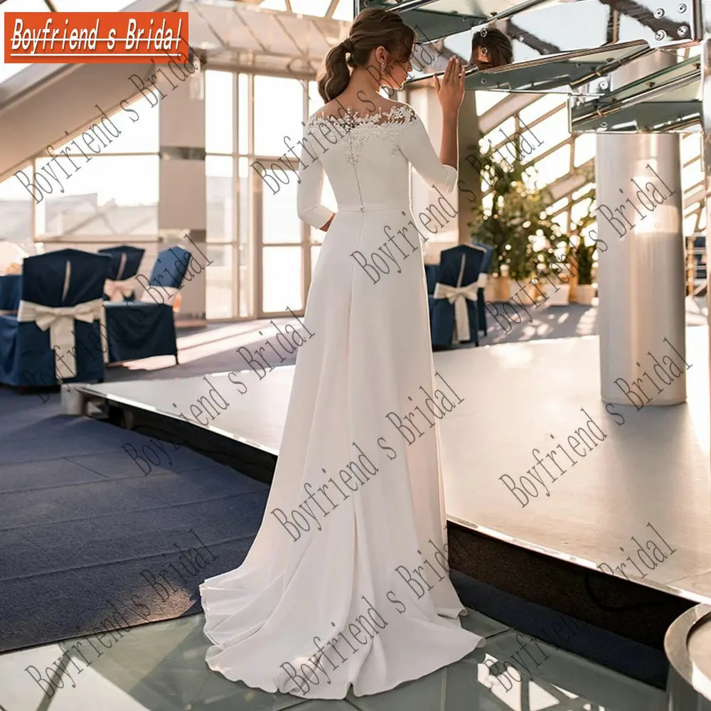 Платье свадебное атласное ТРАПЕЦИЕВИДНОЕ с круглым вырезом, рукавом 34 и кружевной аппликацией