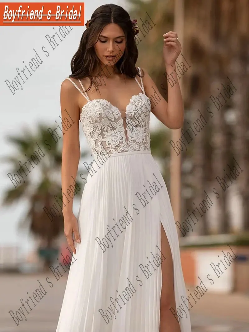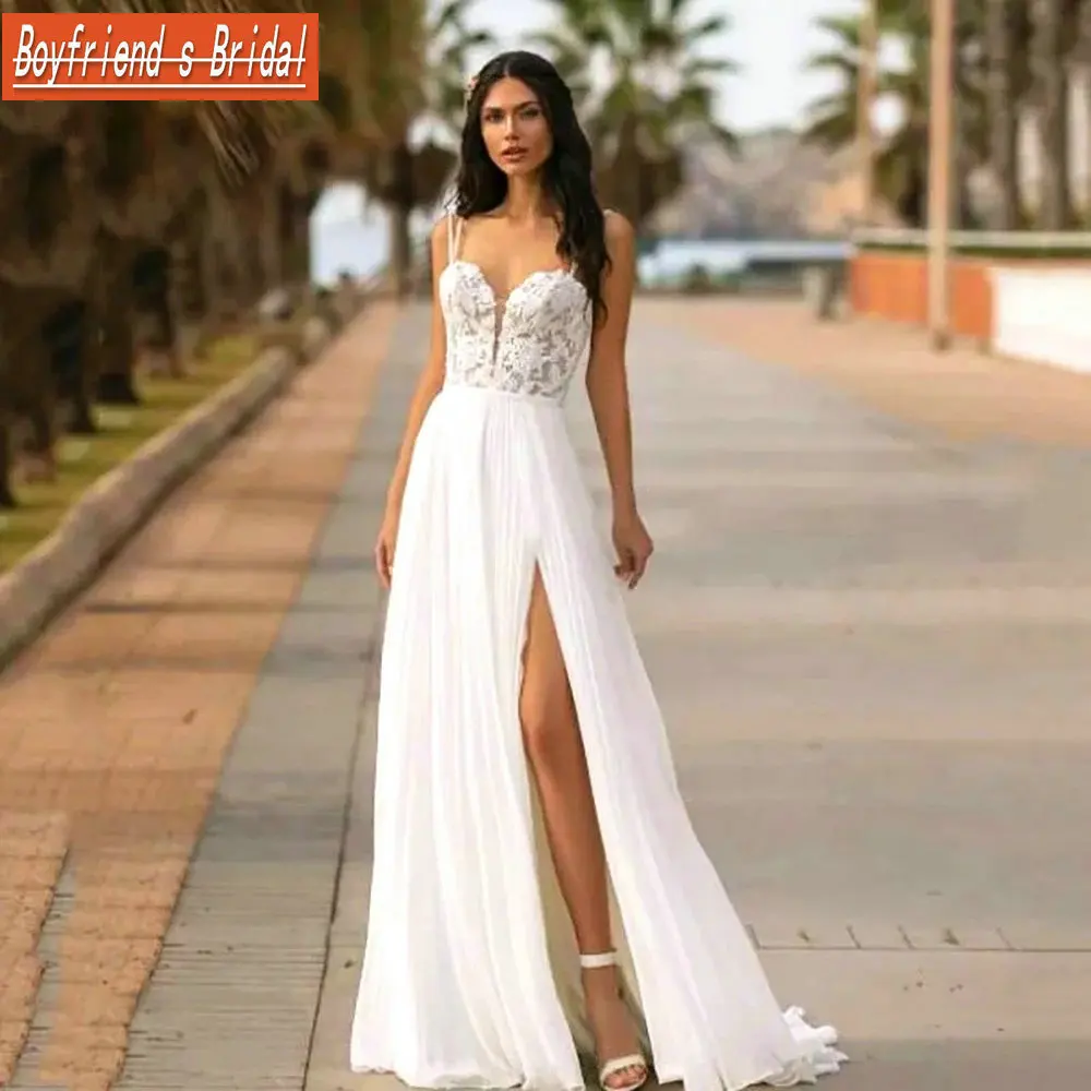 Шифоновое свадебное платье на бретелях-спагетти, модель 2021 года, с Боковым Разрезом, а-силуэт, Кружевная аппликация, плиссированная пляжная юбка, открытая спина, со шлейфом