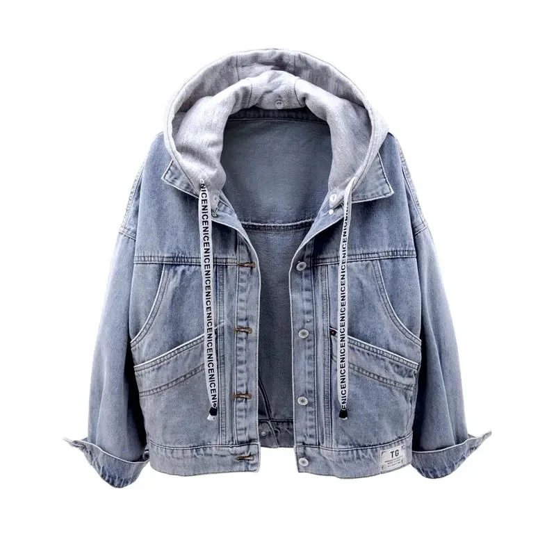 Женская джинсовая куртка с капюшоном и отложным воротником