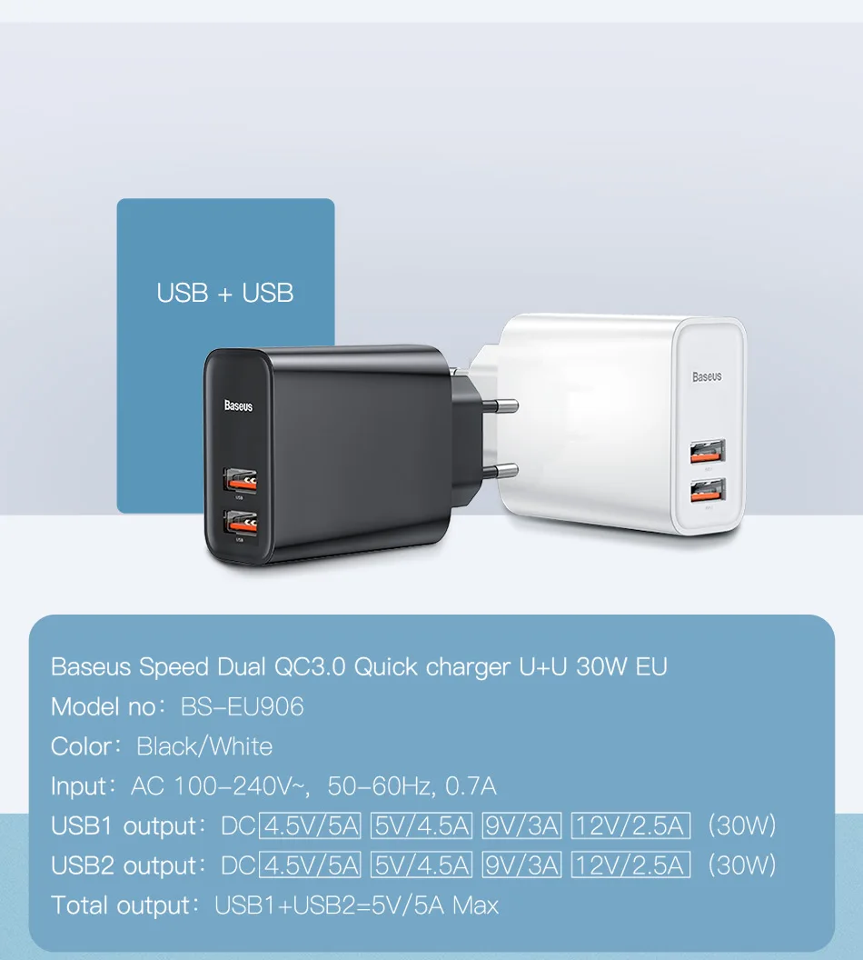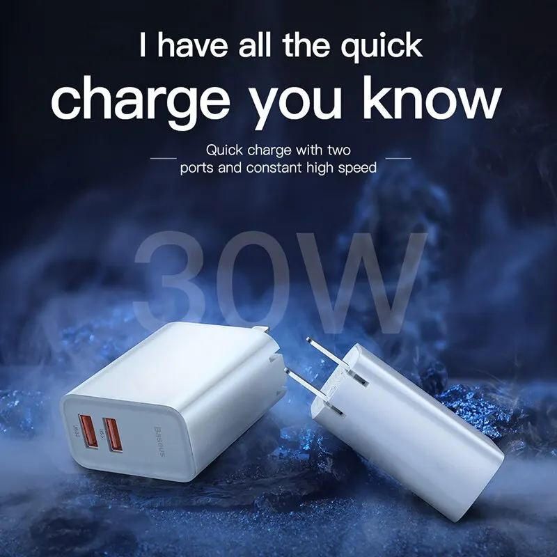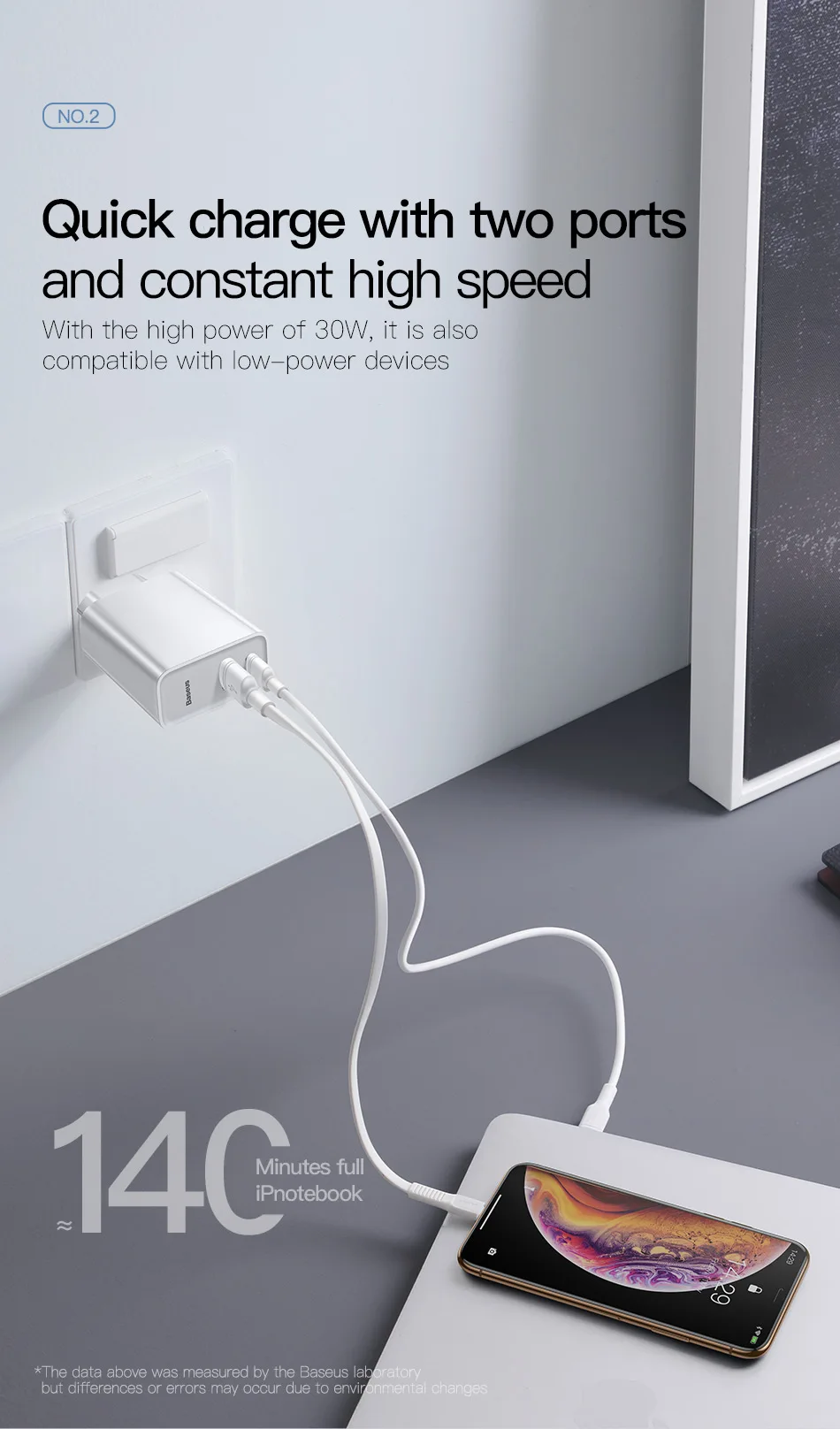 Зарядное устройство Baseus сетевое с двумя USB-портами и поддержкой быстрой зарядки, 30 Вт