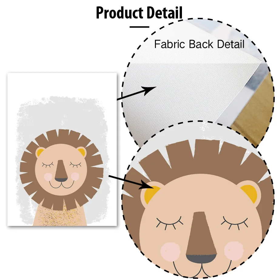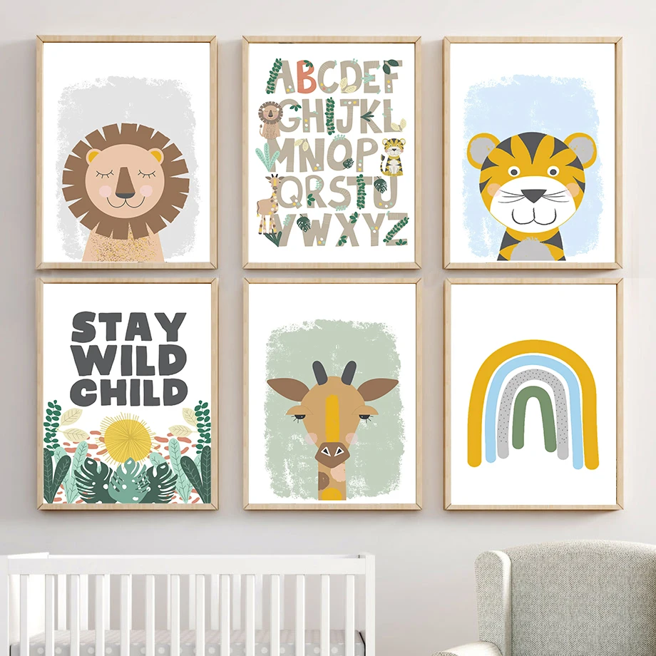 Картина из холста в скандинавском стиле с изображением льва тигра жирафа цифр радуги