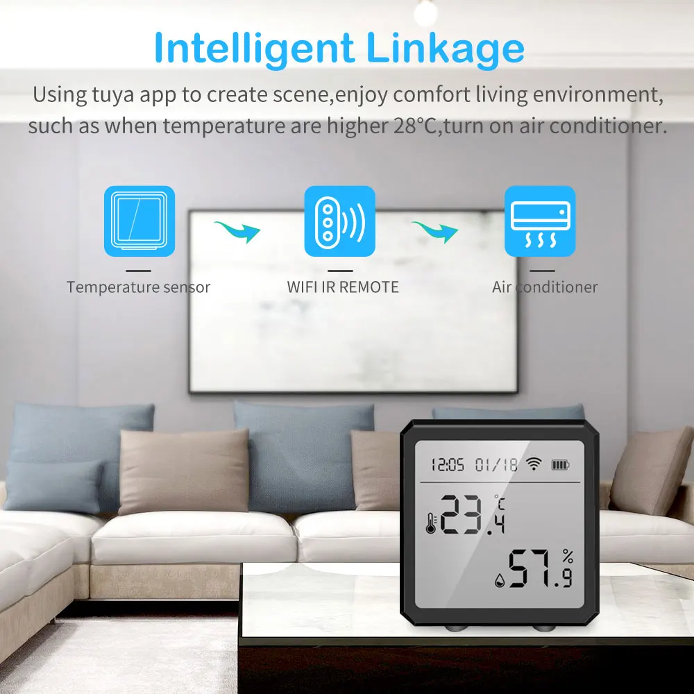 Датчик температуры и влажности Wi-Fi может быть соединен с другими смарт-устройствами в доме, чтобы улучшить нагрев и охлаждение в помещении и сделать ваш дом более комфортным.