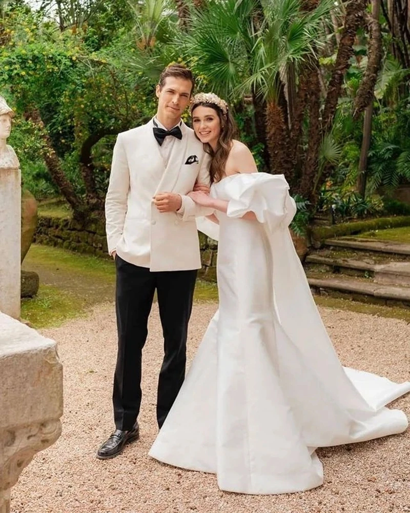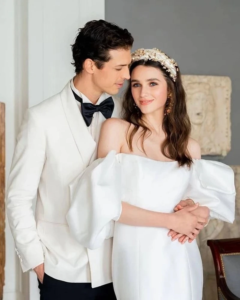 Свадебное платье с открытыми плечами и кружевной аппликацией, темно...