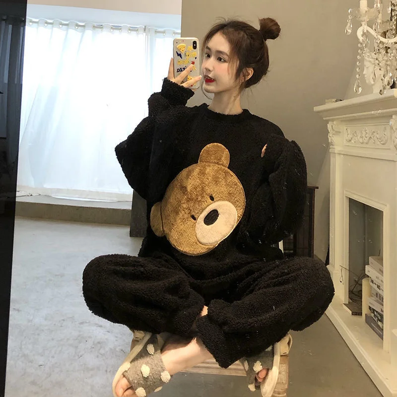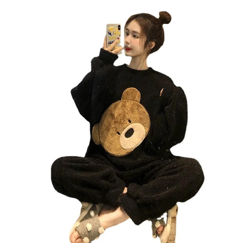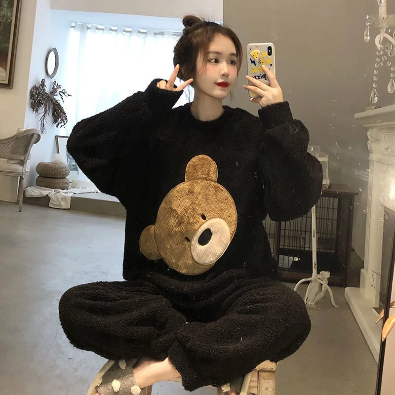 Зимние плюшевые пижамы, женские Зимние коралловые Плюшевые Милые Мультяшные плюшевые осенние и зимние утепленные Фланелевые домашние комплекты одежды