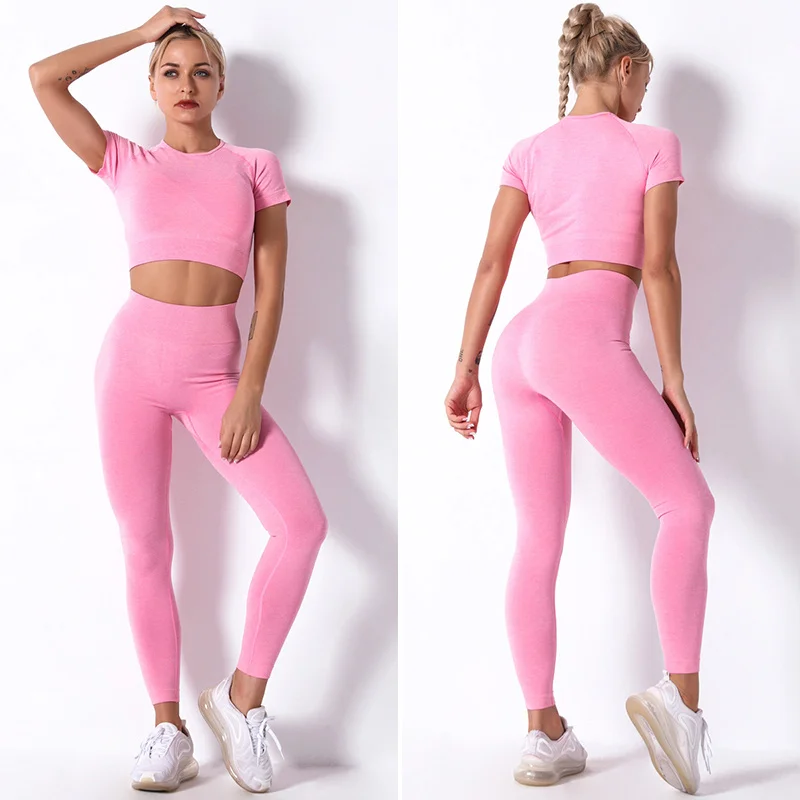 Спортивный бесшовный комплект из 4 предметов, женская розовая Спортивная одежда для тренажерного зала, одежда для фитнеса, спортивный бюстгальтер, леггинсы с высокой талией, спортивный костюм