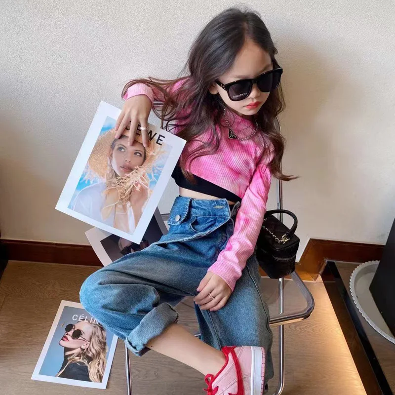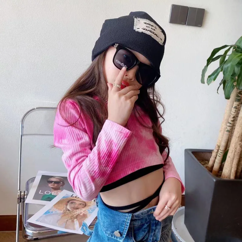 Демисезонная футболка для девочек, детская короткая футболка, детский кроп-топ, детская одежда, уличная одежда, модная розовая, окрашенная в галстук, от 4 до 13 лет