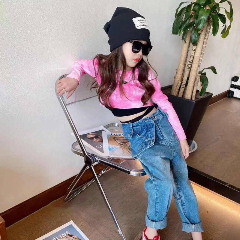 Название:Весенне-осенняя футболка для девочек короткая футболка для малышей детский укороченный топ, детская одежда модная уличная одежда розового цвета с галстуком для детей от 4 до 13 лет