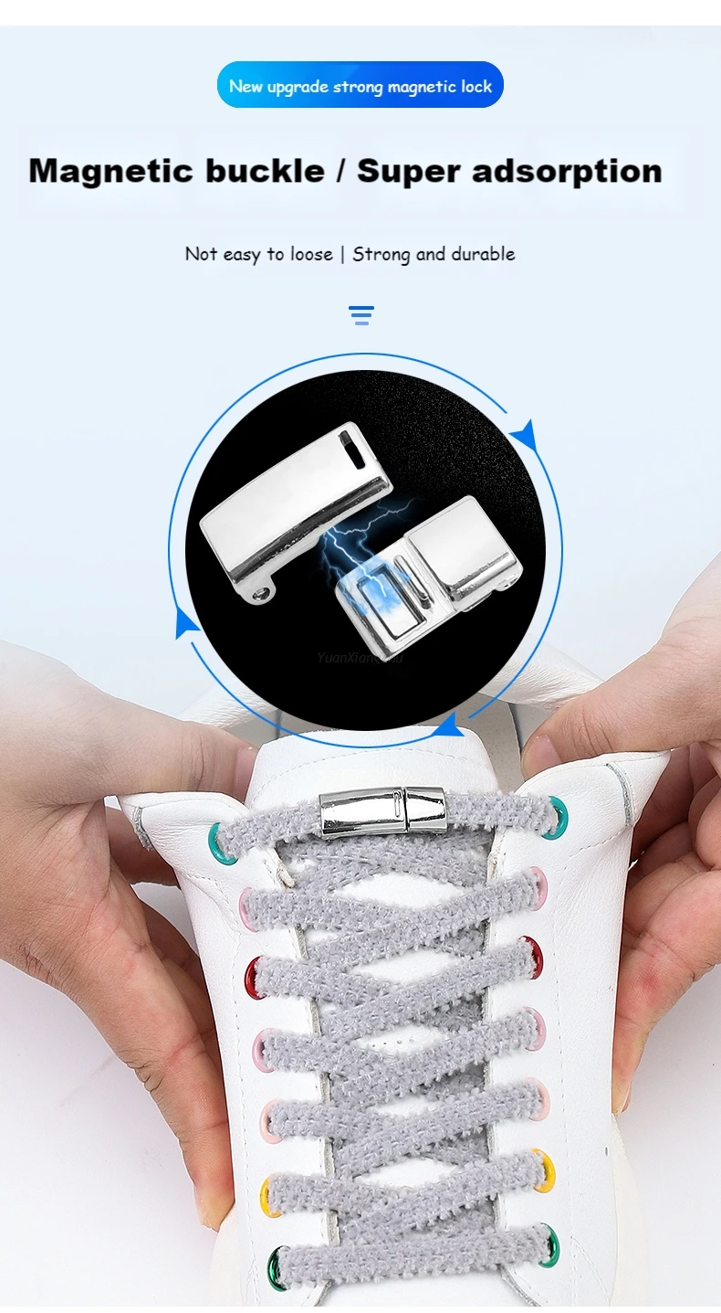 Научный дизайн: обновленная версия, шнурки без галстука имеют уникальную изогнутую магнитную пряжку и плоская эластичная веревка. Конструкция с двойным замком на магнитной застежке позволяет вам никогда не беспокоиться о том, что шнурки будут ослаблены; кружевные замки изогнуты и оснащены плоским тянущимся шнуром, который идеально сочетается с ногами, чтобы ваши ноги были удобны в течение всего дня.