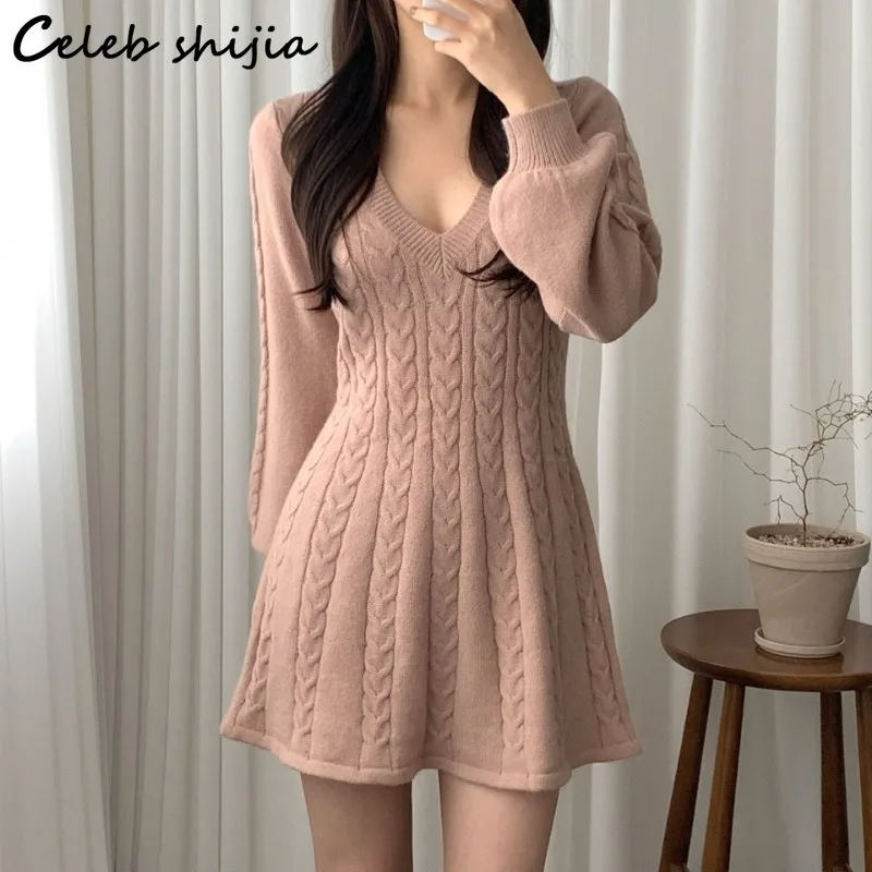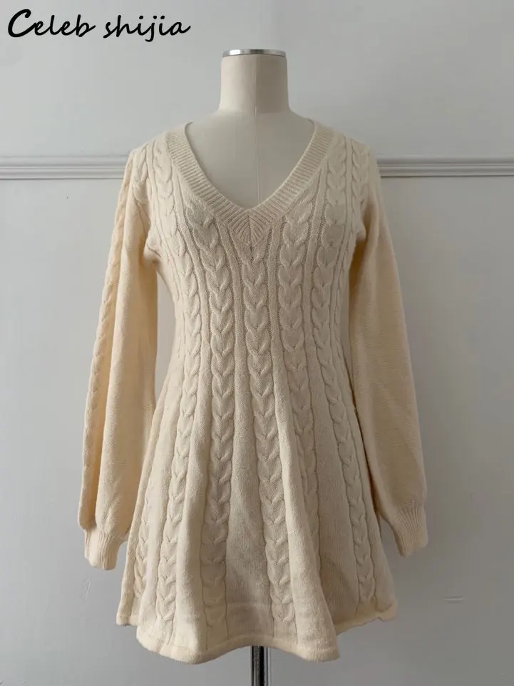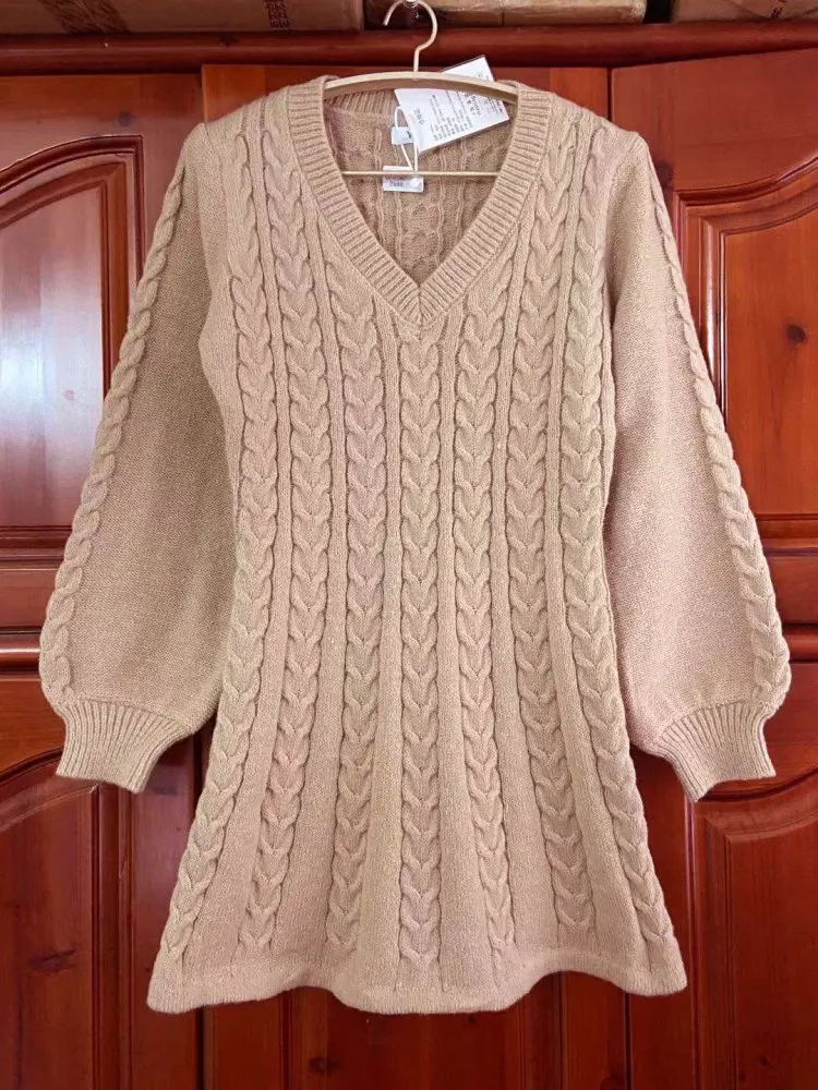Женское трикотажное платье-свитер с V-образным вырезом и рукавами-фонариками