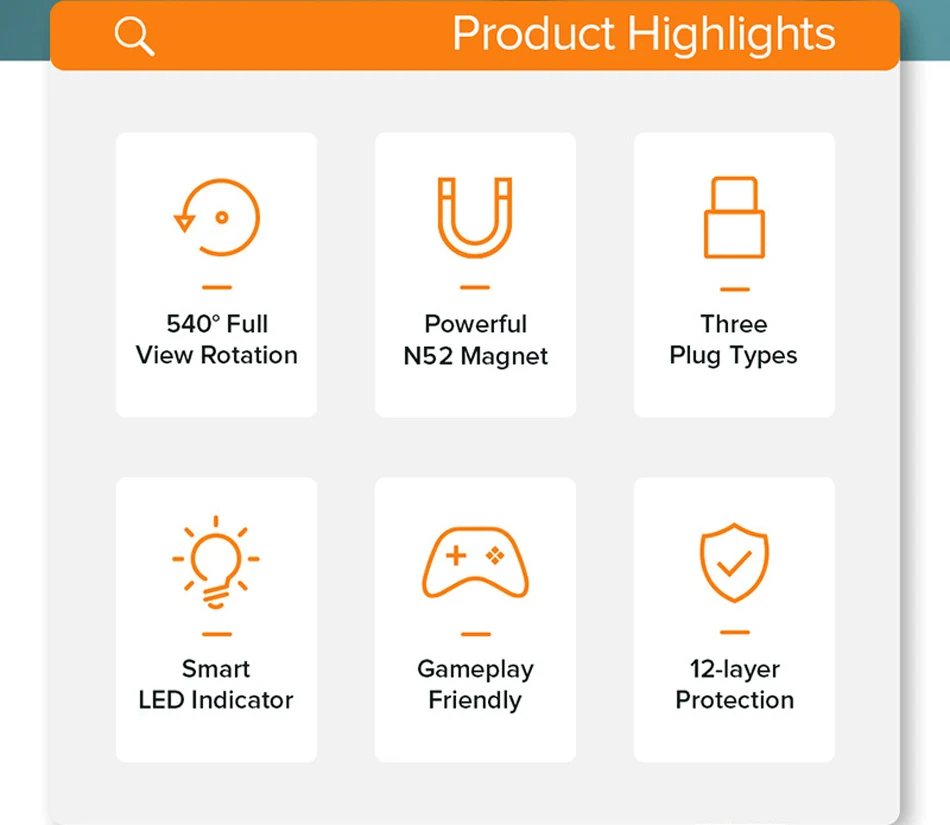 Feature 4Dustproof Plug 540 90 &180 & 360 Degree Rotation